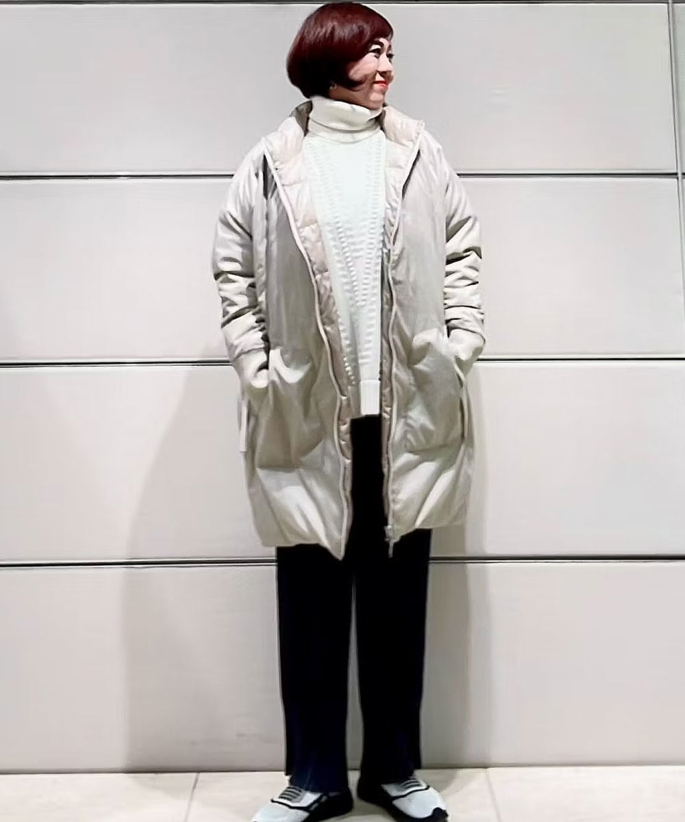 丁度ヒップにかかるくらいの着丈なので、パンツにもスカートにもバランス良く合わせていただけます。