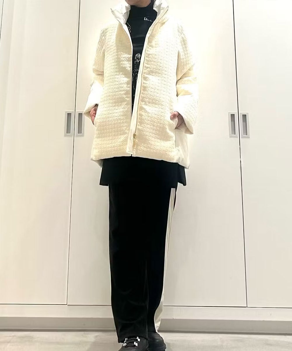 クラシカルな千鳥柄ジャガード素材が品良く映えるダウンジャケットです。