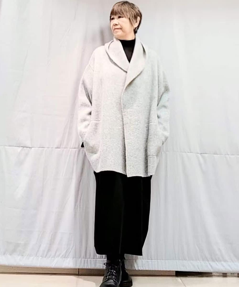ニットコートはWOOL100%のストレート糸とブークレー糸を合わせて表情感がある編み地にしたコートカーディガン。