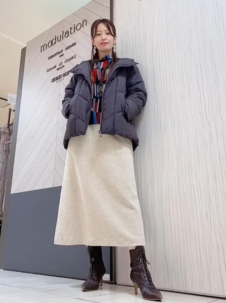 コートはドットジャガードのタフタ生地を使用した高級感のあるダウンコート。膨らみのある襟にはフードが内蔵されていて実用的。ダウン混率88%でとっても暖か。冬のお出掛けに頼りになるダウンコートです。