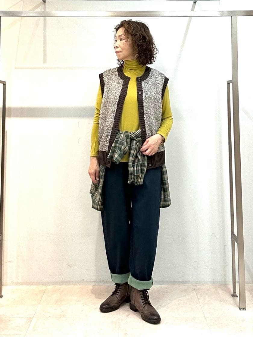 リブ仕様の無地ニットとの異素材コンビネーションが、着こなしにさりげないアクセントを添え、レイヤードスタイルを楽しめます。