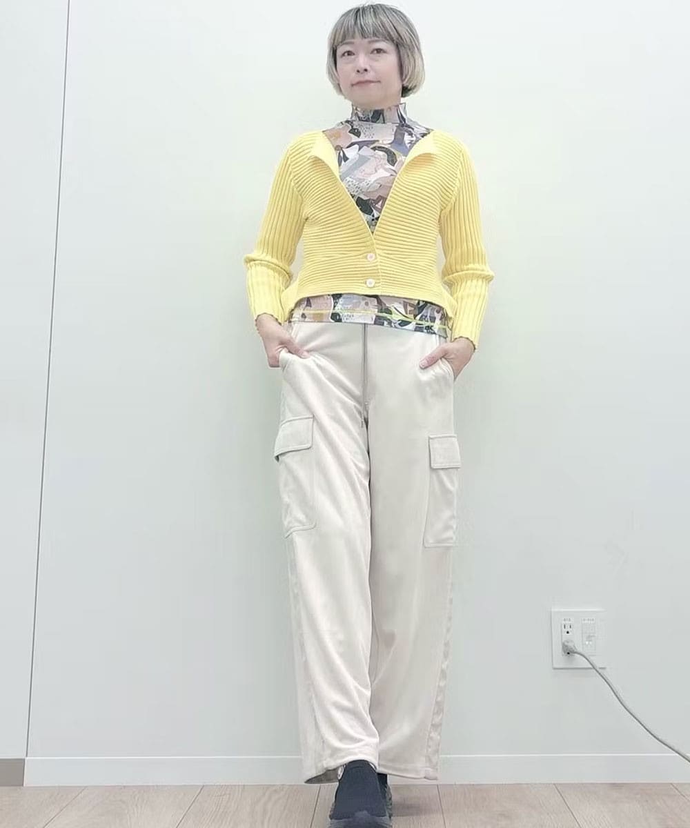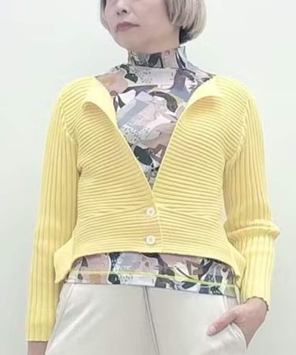 コンパクトなシルエットのニットジャケットは春にぴったりなカラーが目を惹きます。