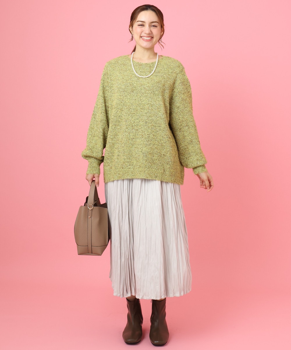 女性らしさを引き立てるゆるニットにはスカート合わせで王道スタイルに。