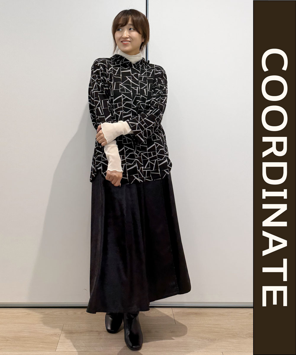 ・襟元のスクエアデザインが斬新で一枚で着てもさり気ないポイントになり、シャツをレイヤードしたコーデもおすすめです。