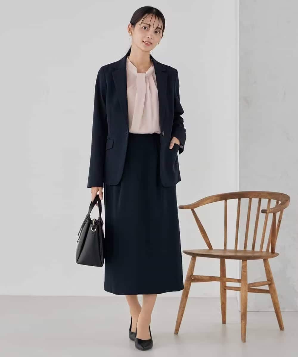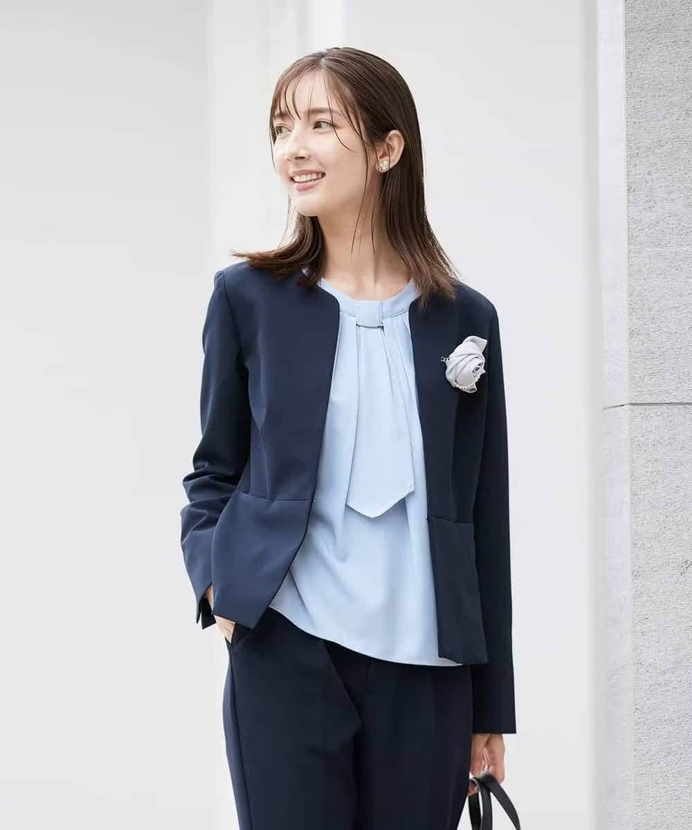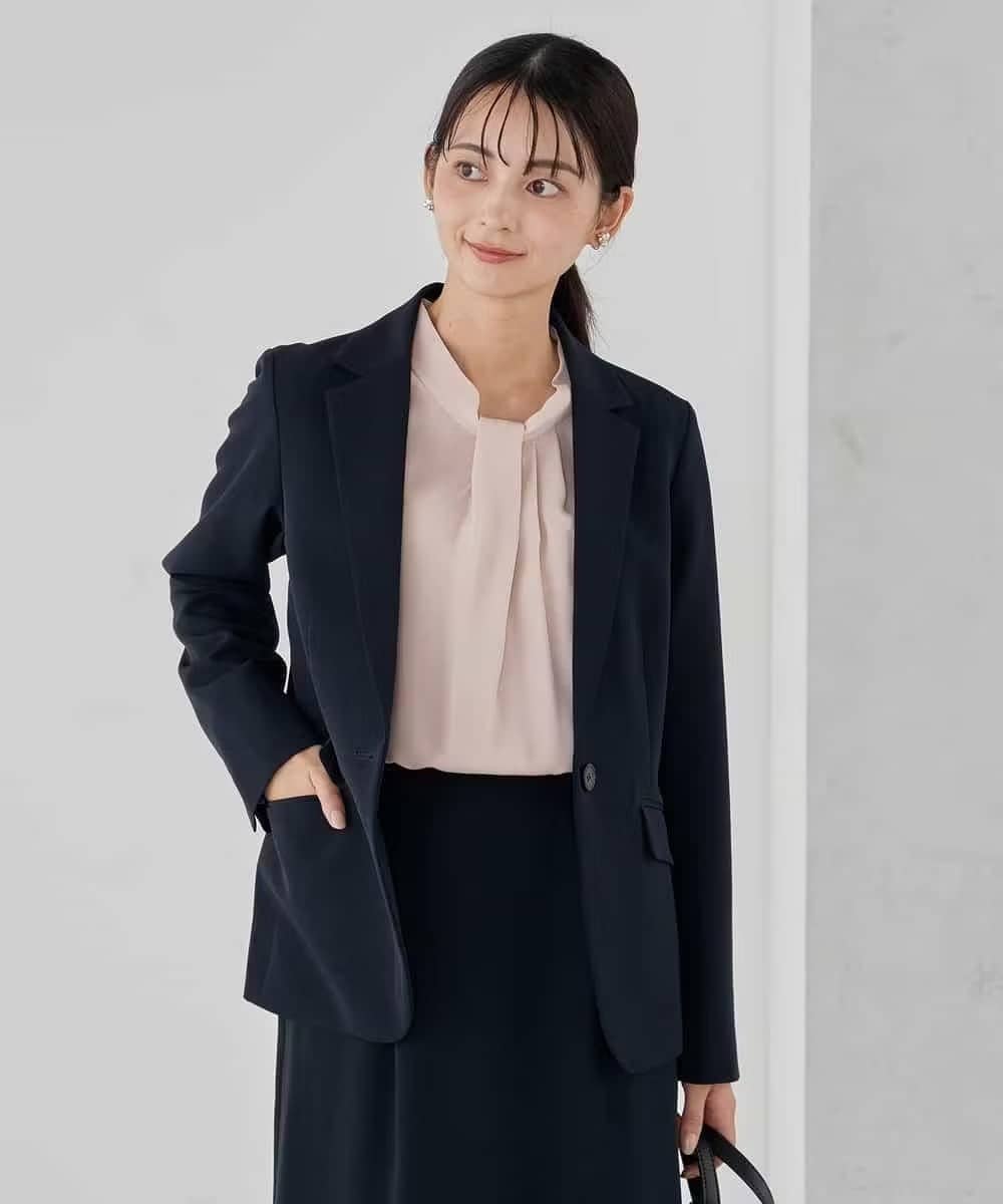 ノーカラー・テーラードデザインより程よい短め丈で、パンツ、スカートどちらもすっきり着こなせる丈感。こちらも背抜き仕様で、脇下消臭テープ、内ポケット完備で機能性も抜群です。バックスタイルがさりげないペプラムシルエットになっておりネイビーやブラックスタイルも女性らしい雰囲気をプラス。ワンピースとも相性抜群です◎