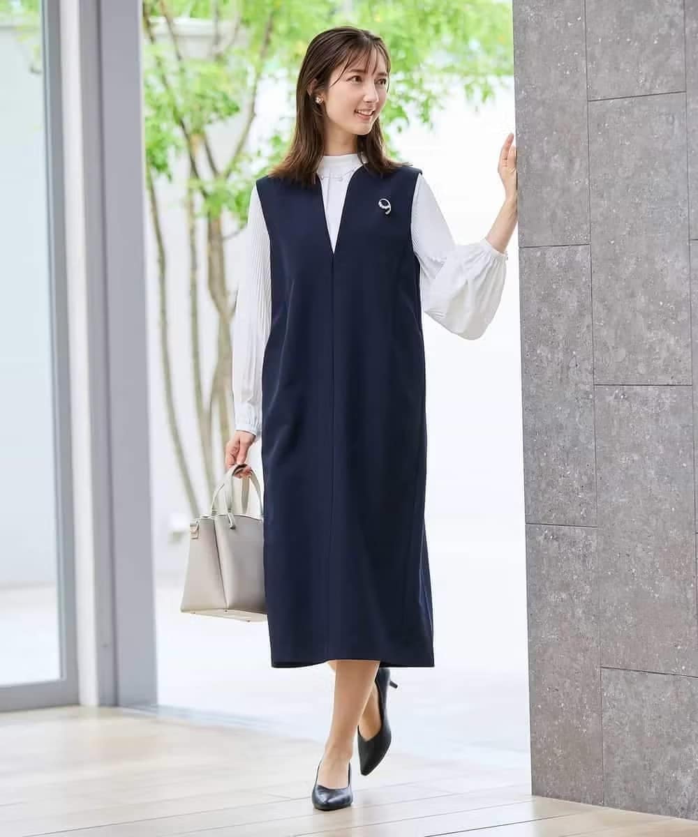 身体のラインが出にくいIラインシルエットでストレッチも効いているため着心地が快適◎インナー次第でシーンも幅広く着用期間も長いのが嬉しいポイント。ブローチを付けたり、ジャケットを羽織ってハレの日にもおすすめです◎