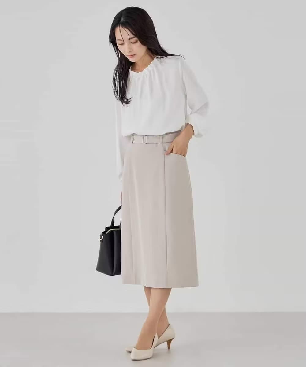 細身すぎないシルエットで動きやすい程よいタイトシルエットなスカート。縦ラインの切り替えでスタイルアップ効果も◎共布ベルト付でウエストマークするとシルエットがより綺麗に見え、トップスをインした時もきちんと決まります。ウエストは後ろゴム仕様で穿き心地も抜群◎