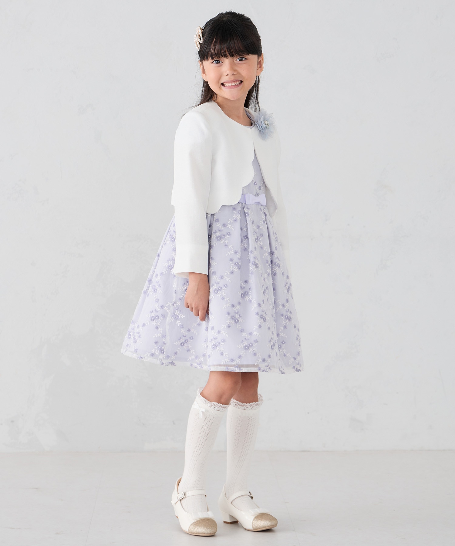 花柄刺繍が華やかなラベンダーのワンピースにホワイト系のアイテムを合わせたロマンティックなコーディネート。