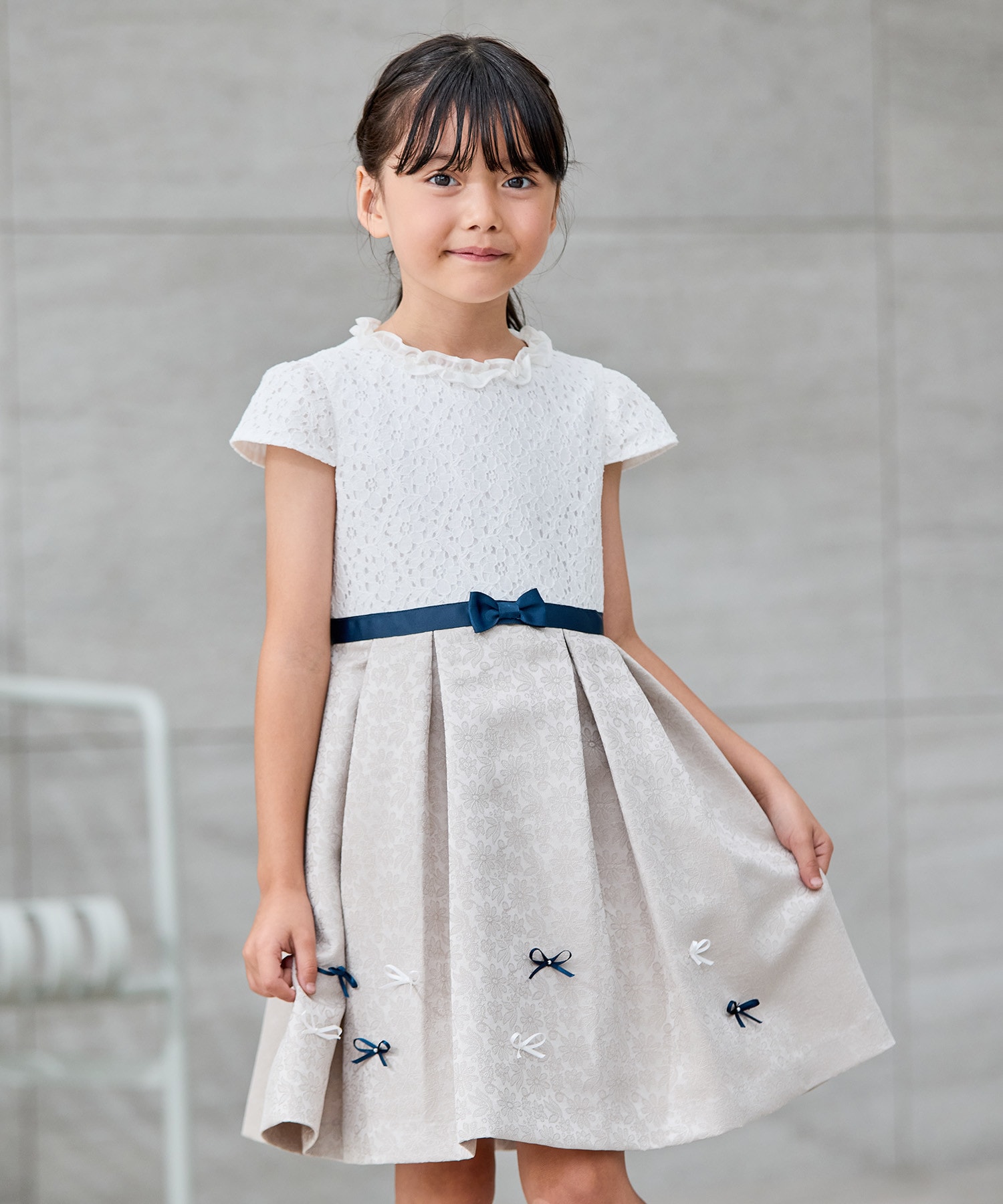 レースの身頃と高見えするジャガード生地のスカートの組み合わせが華やかなワンピース。