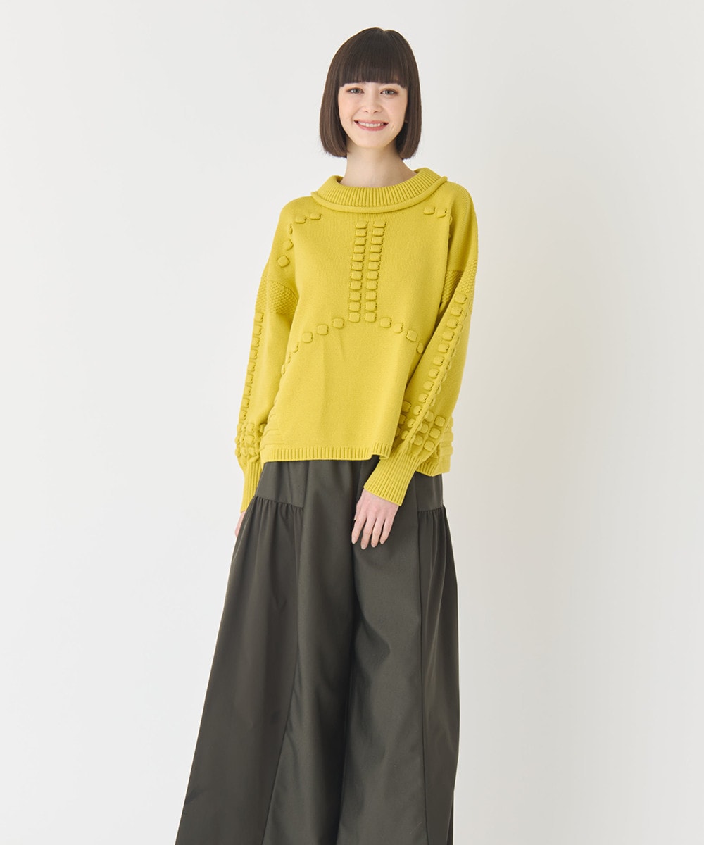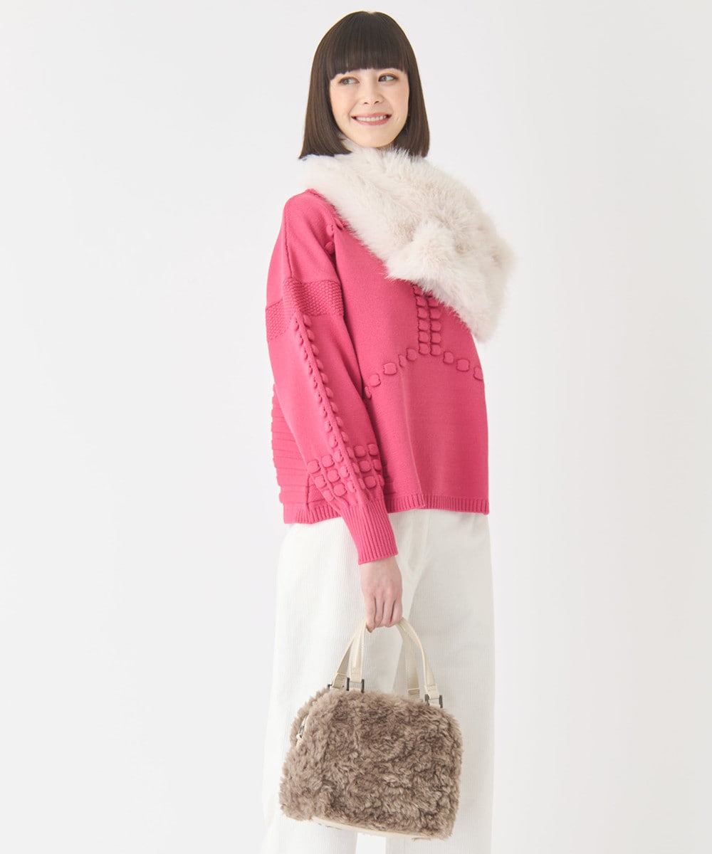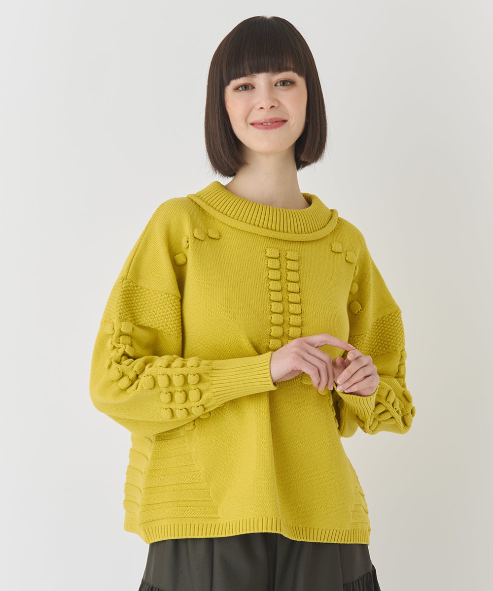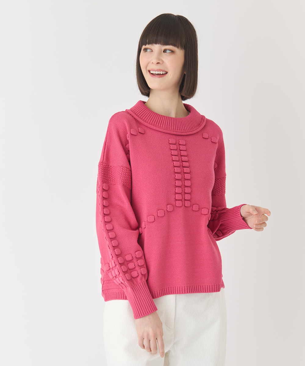 春まで活躍間違いなし!袖や前身頃にはタック編みで表現したポコポコとした編地。華やかで表情豊かな見た目を演出してくれます。