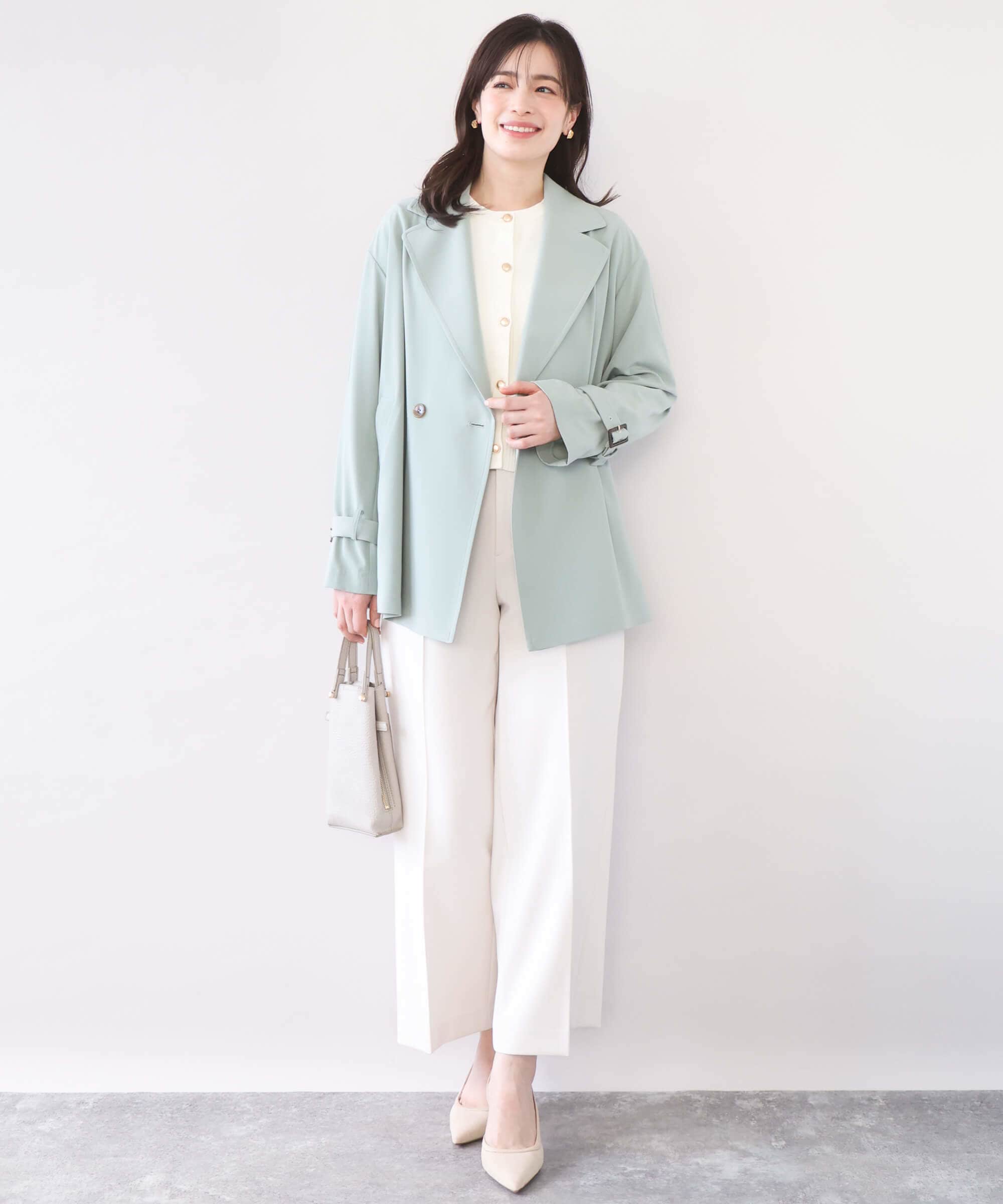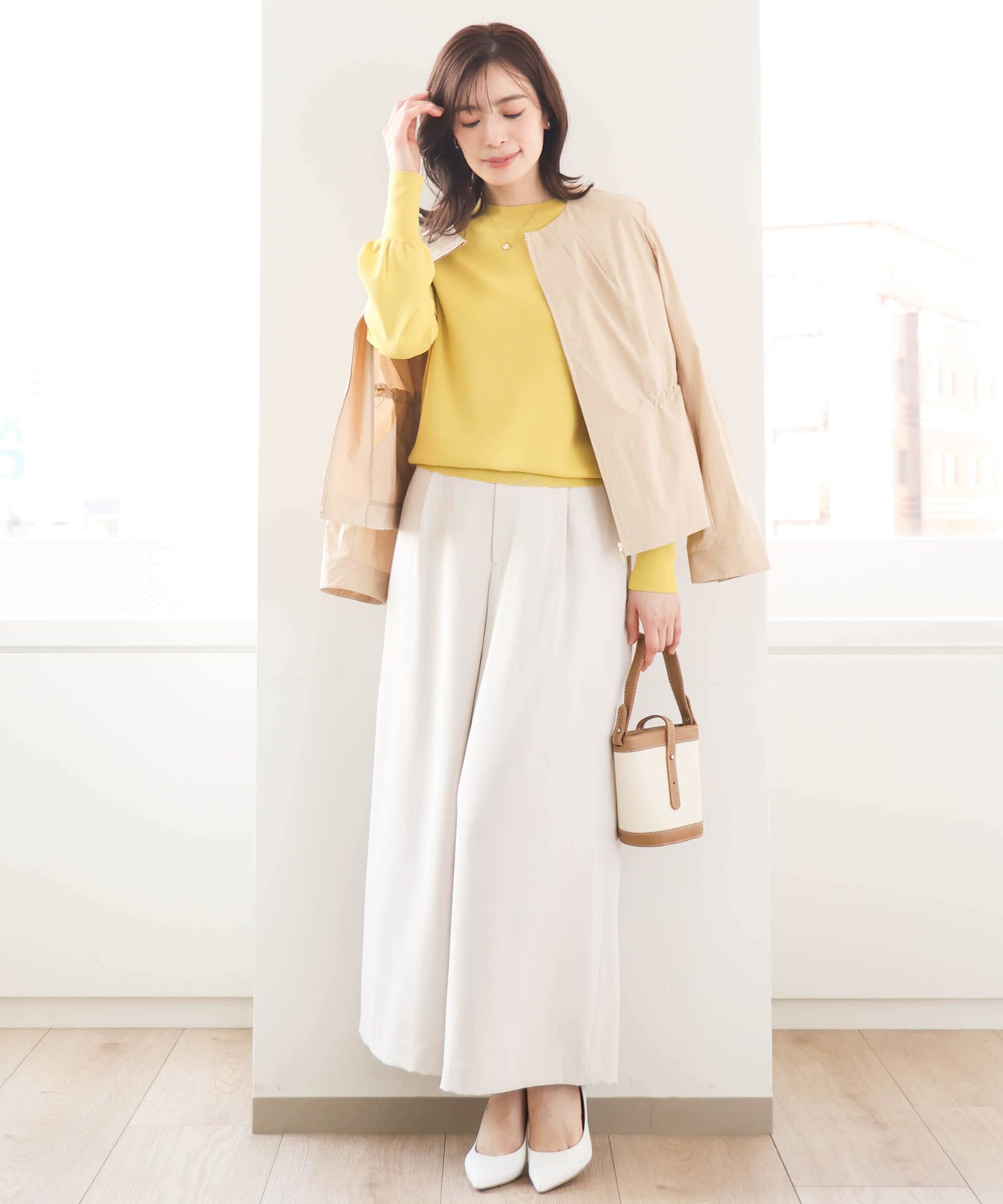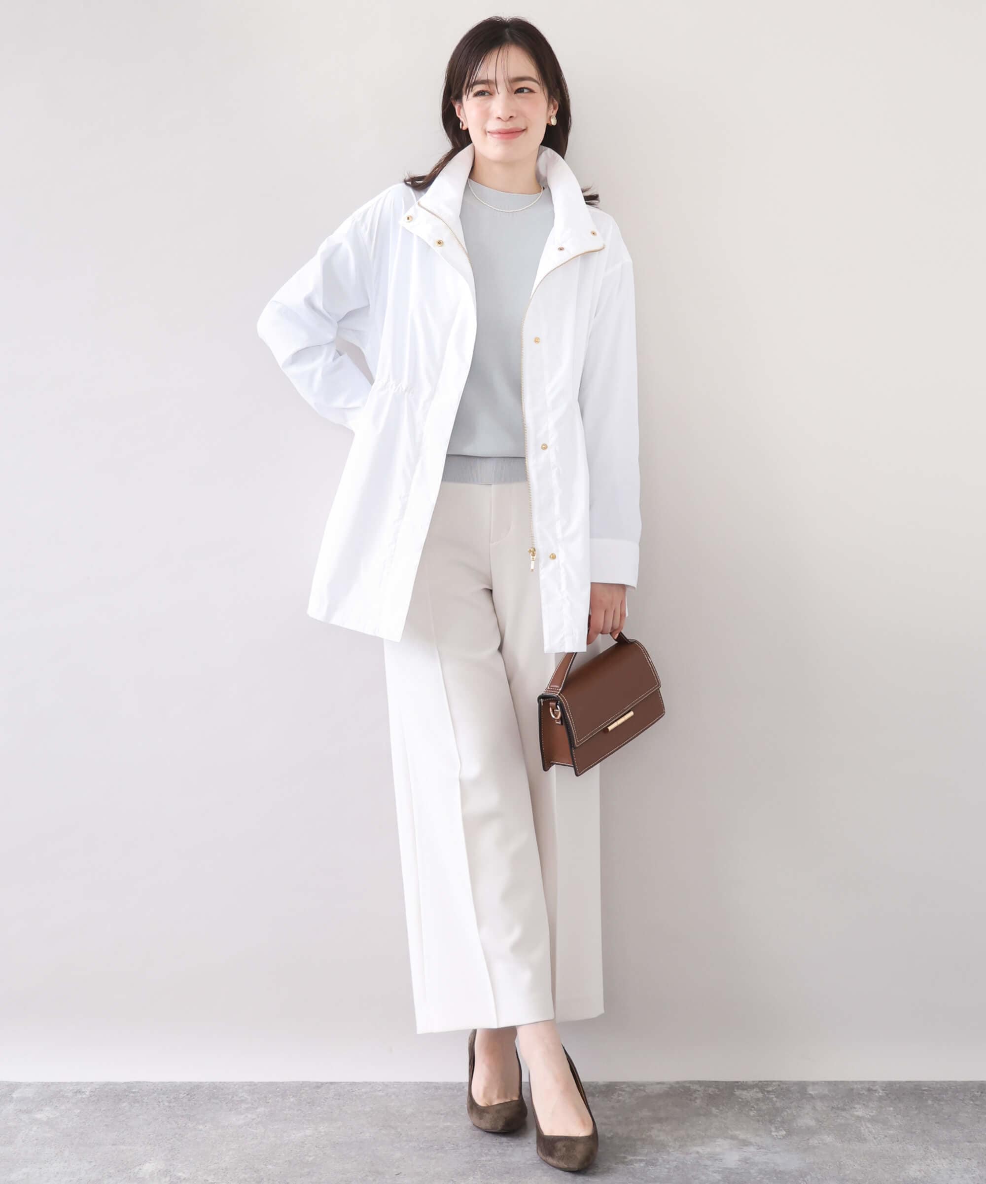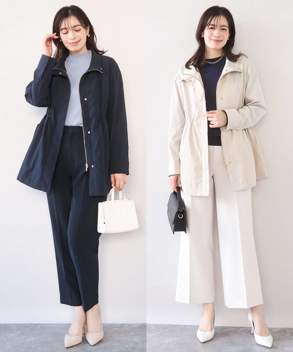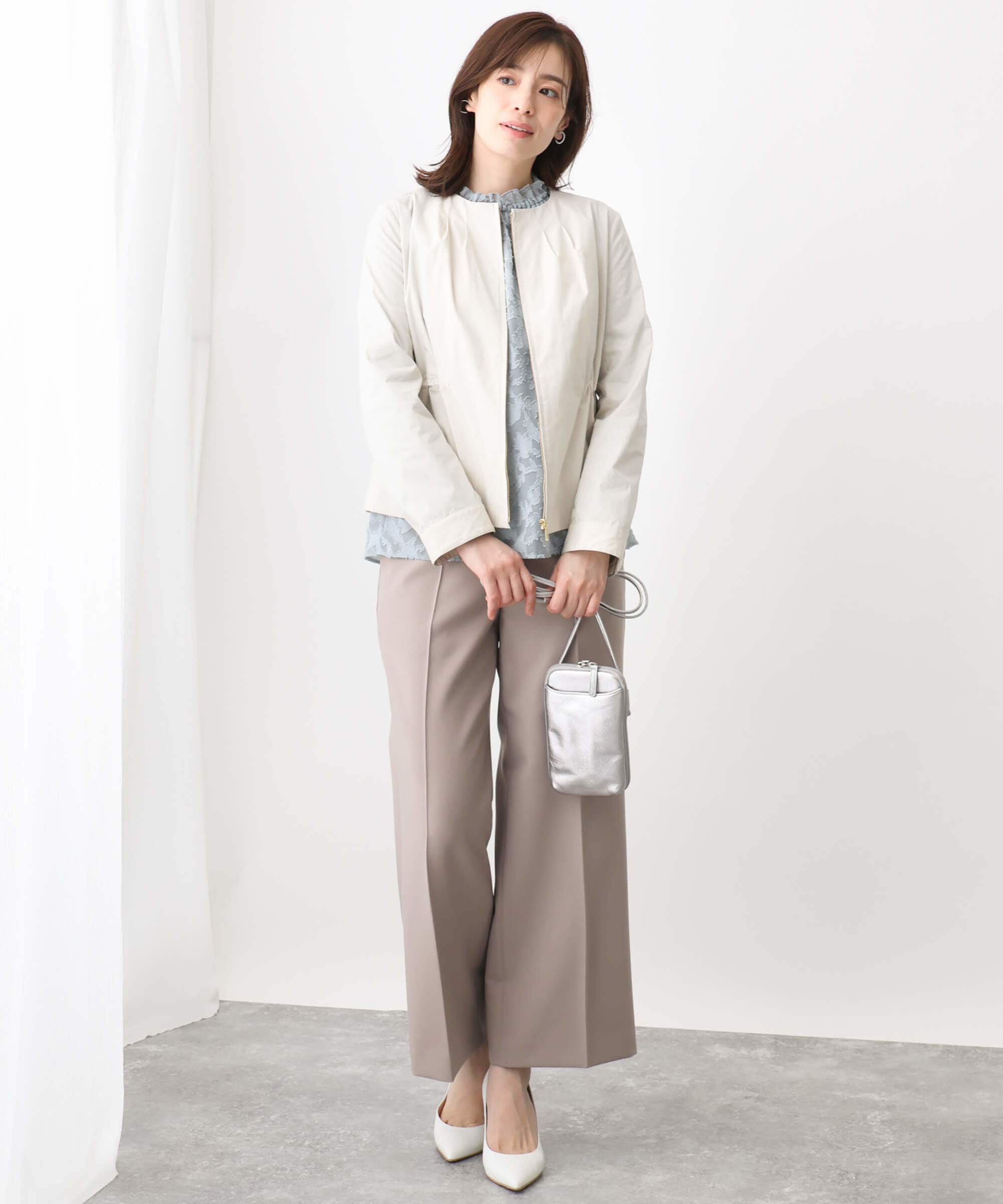 コンパクトな着丈がバランスの取りやすいブルゾンは、すっきりとした印象に。裏地なしの軽さが特徴です。毎日のお仕事からお休みの日まで幅広いシーンで着こなせるアウターは、春色にも馴染むニュアンスカラー2色展開です。