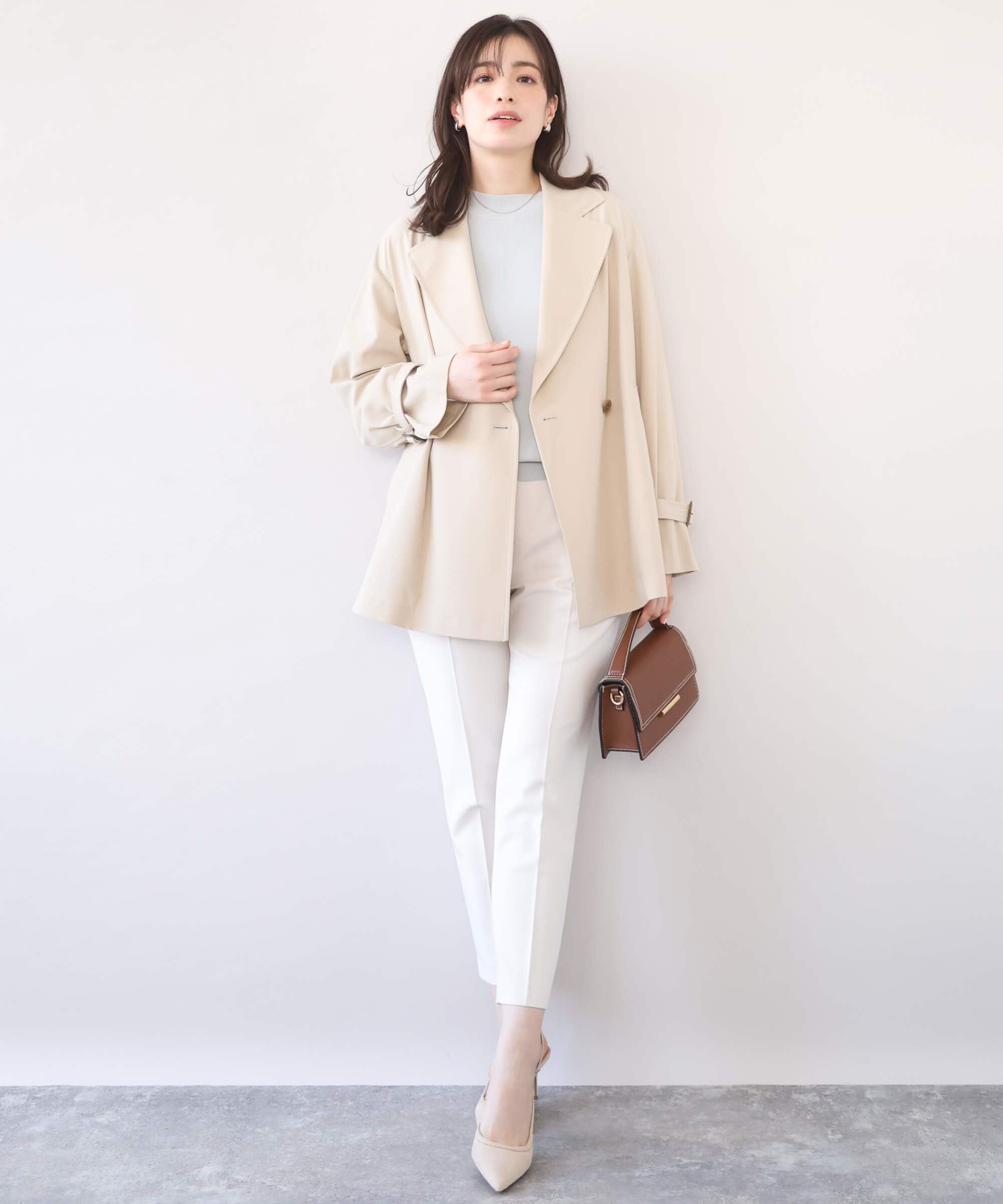 トレンチコートをもっとラフに気軽に羽織りたい気分にぴったりなショート丈タイプもご用意。やわらかで落ち感のある素材はさっと羽織りやすく、堅苦しくならずに着こなせます。きちんと感もトレンド感もどちらも押さえたいあなたにぴったりな春アウターです。