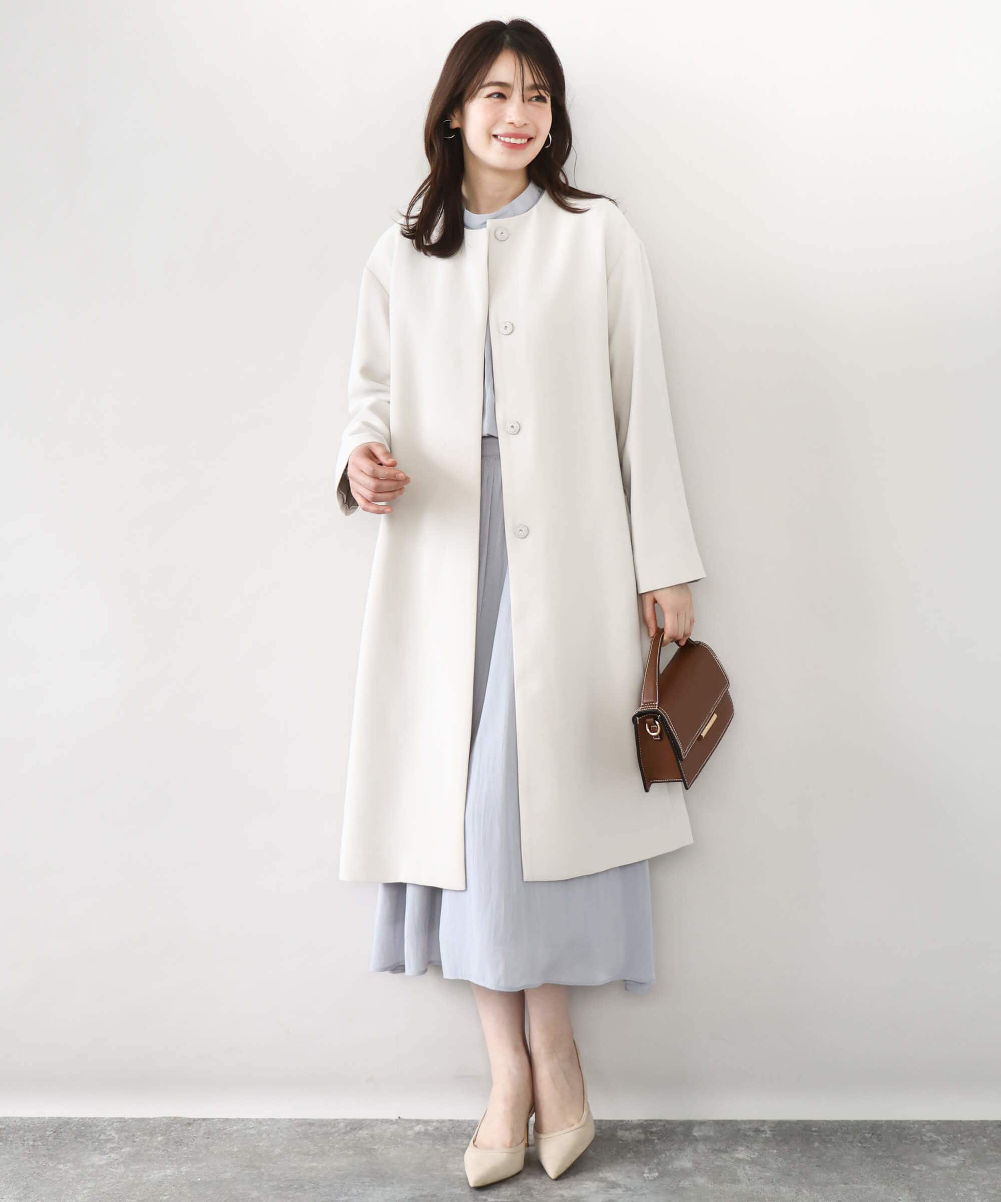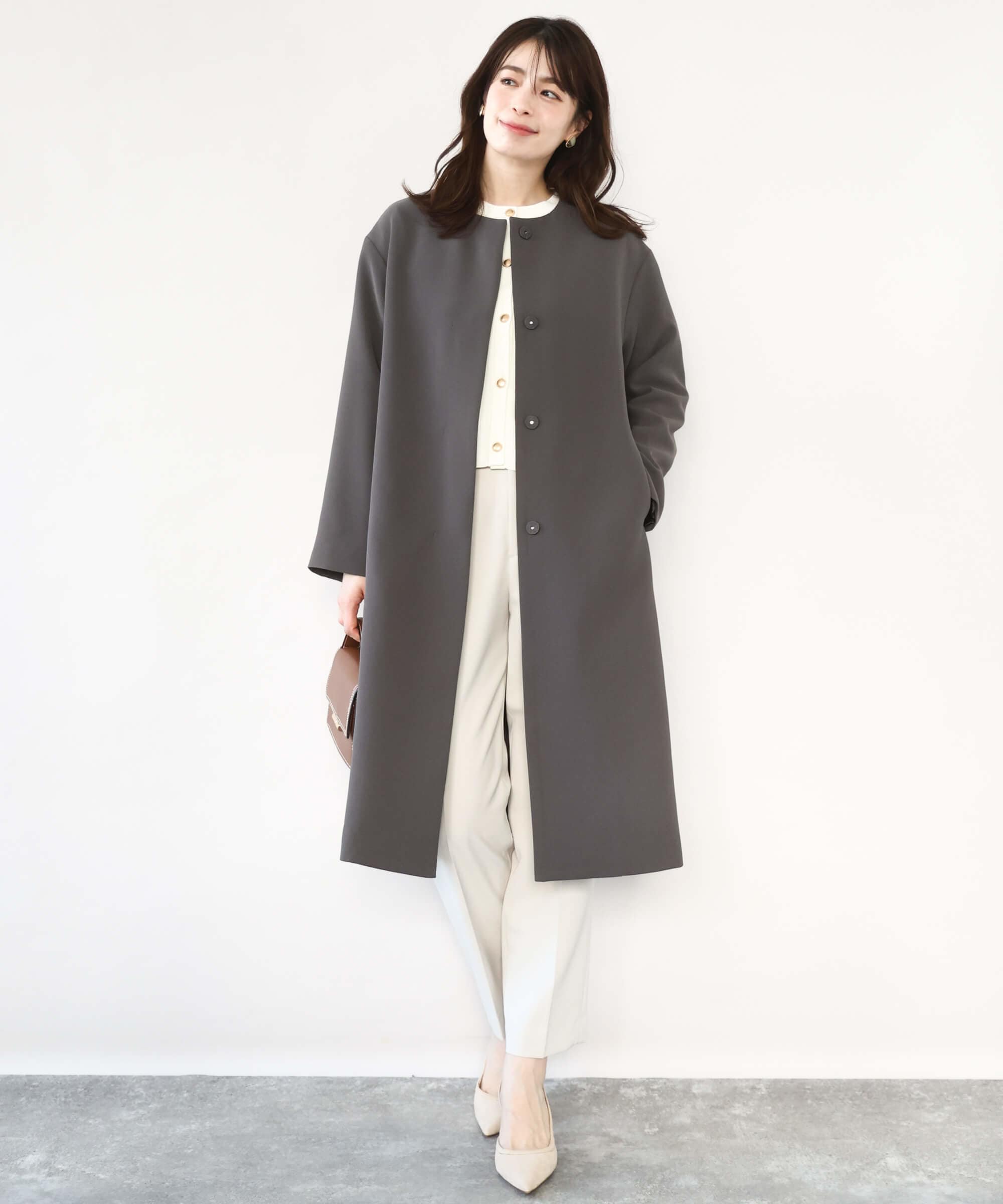 シンプルが嬉しいコートはノーカラーデザインがすっきりと女性らしい印象に。長めの着丈はワンピースからパンツ、スカートと合わせるコーディネートを選びません。薄手すぎない肉感の素材は季節の変わりめにちょうど良く、これからの季節に重宝してくれるはず。