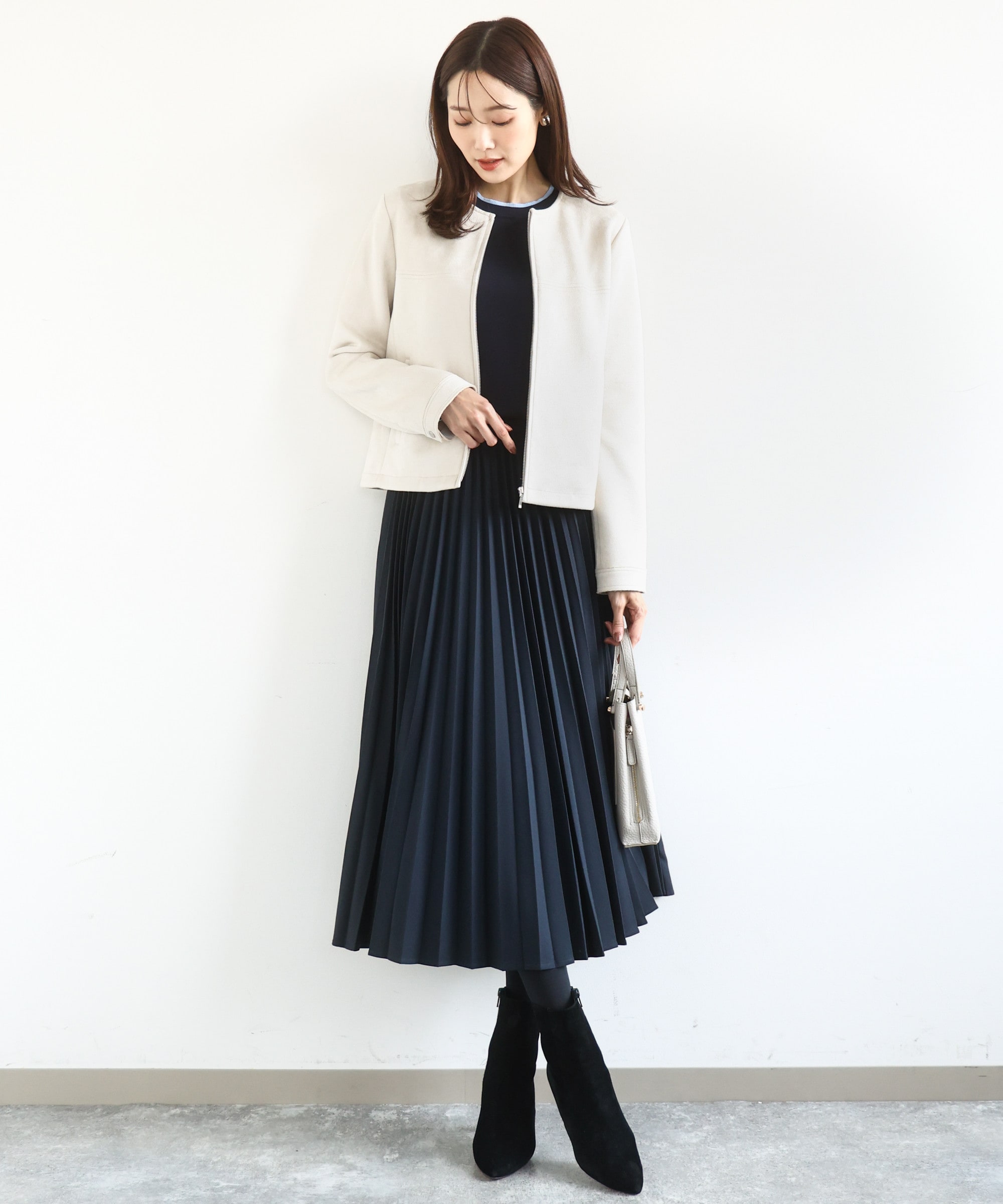 ショート丈の羽織り×ワンピースの最強の組み合わせは、バランスよくコーディネートが決まる優れもの。カーディガンのような羽織りやすさは、きちんと見えしながらもさっと羽織れる着こなしやすさも魅力的。