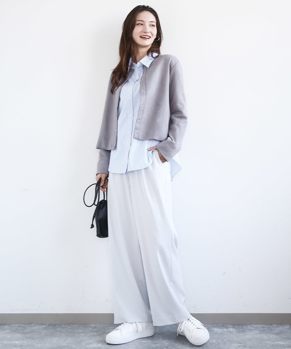 今年の春はカーディガンライクなジャケットをさっと羽織るのが気分。カーディガンよりも肉厚な素材は、何かちょっと羽織りたい、をフォローしてくれる強い味方。フェイクスウェードの素材はやわらかく、ジャケットとしてはもちろん、前釦を閉めてトップスとしても重宝してくれそう。