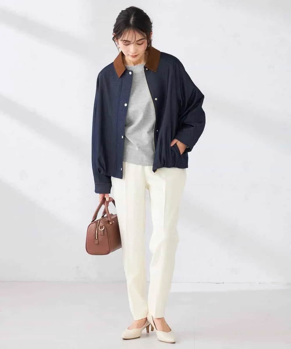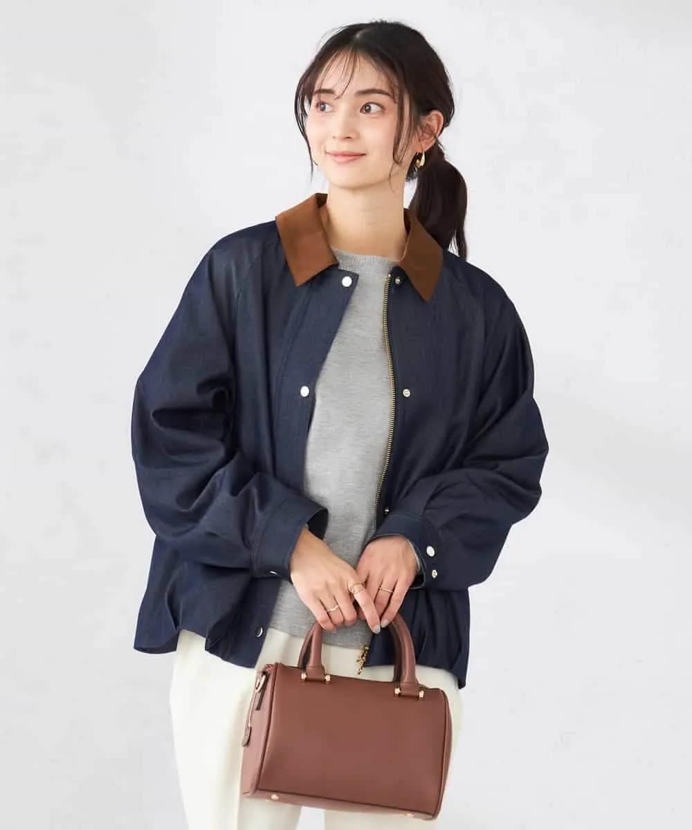 衿配色がお洒落なトレンド継続ステンカラーワークジャケット。デニム見えの落ち感のある素材で丸みのあるシルエットが女性らしくいつものスタイルをぐっと鮮度アップしてくれます。