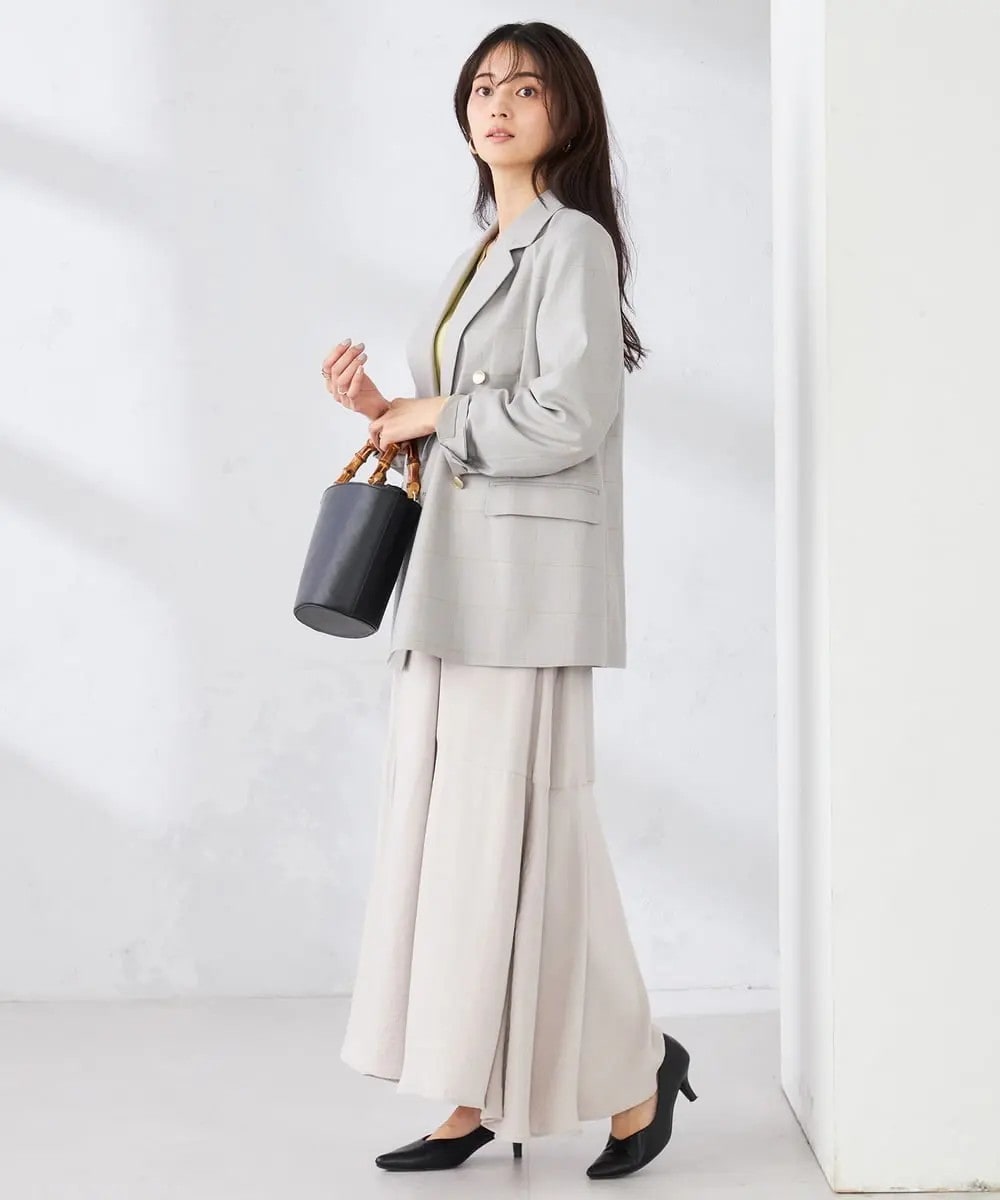 ライトグレーベースのチェック柄Wブレストジャケット。明るめカラーのトップスやボトムと相性抜群で、ベーシックカラーは鮮度アップしてくれる期待の新色!着丈はすこし長めながらもロング丈のスカートともきれいに着こなせる着回し力も魅力です。