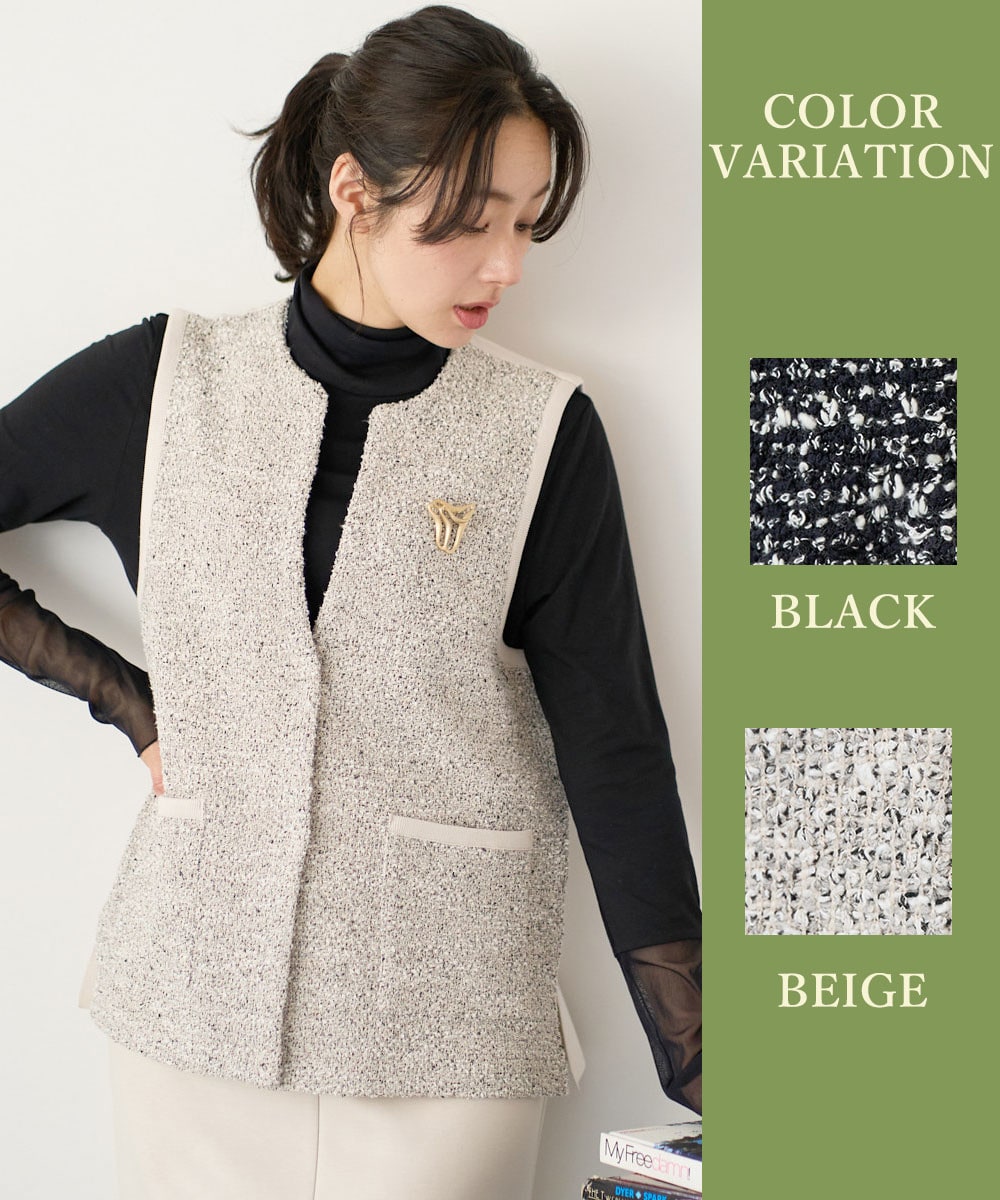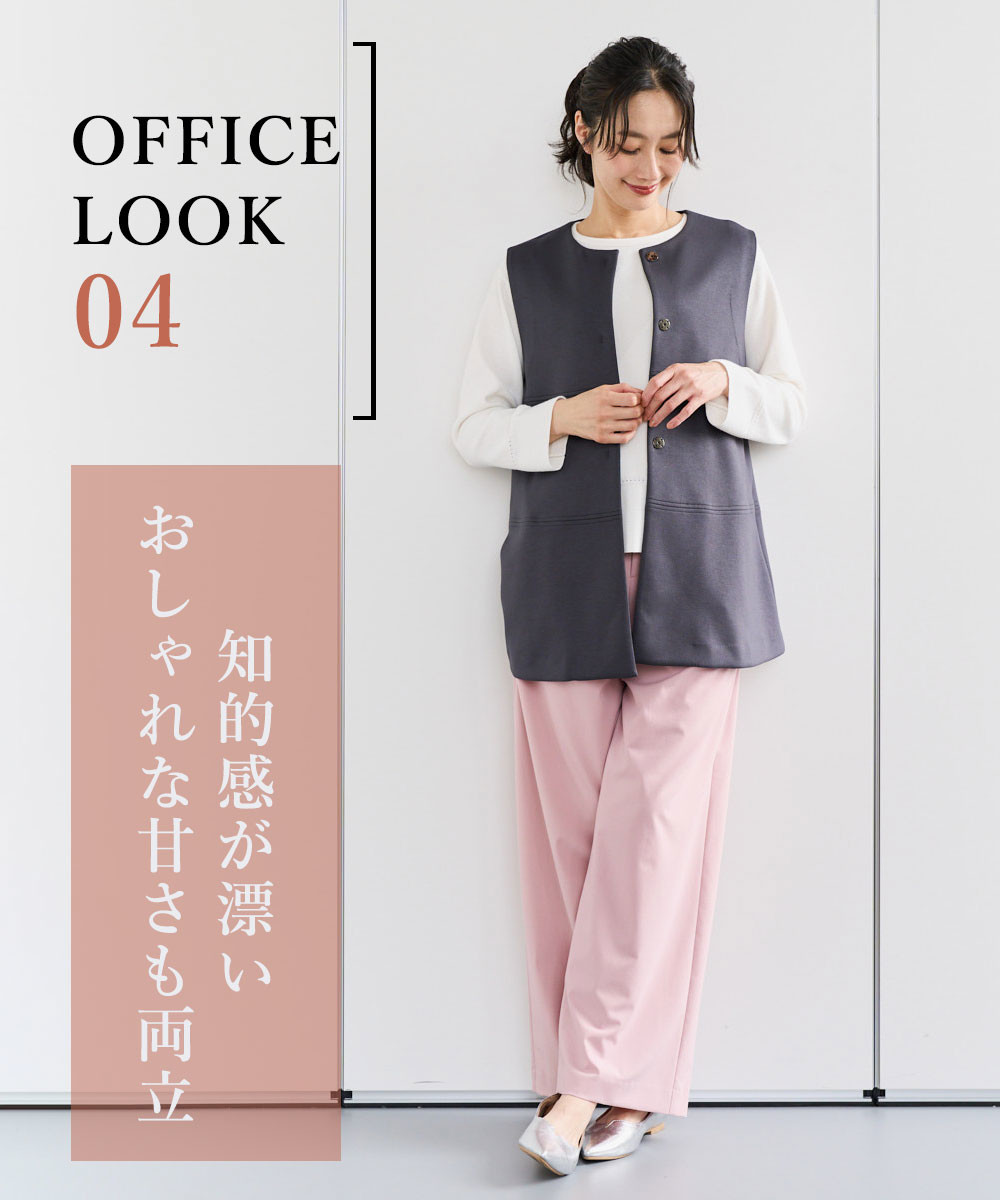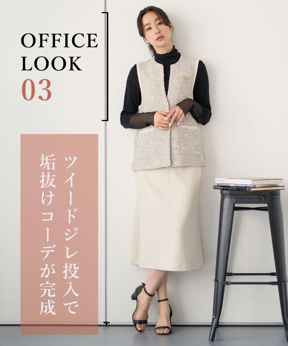 ツイードジレはジャケットよりも堅苦しくなく、ブラウスより洒落感があるので、オフィスカジュアルに最適です。