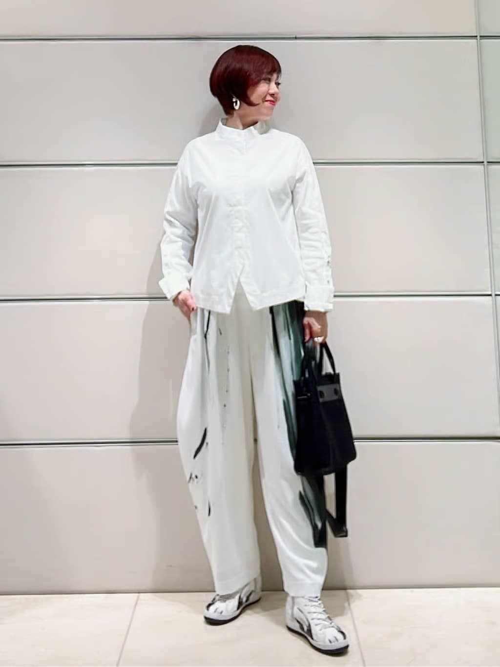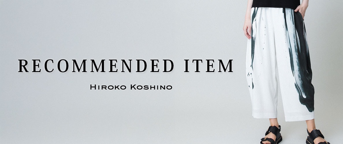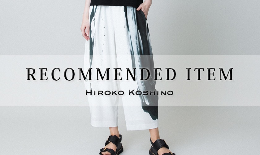 ヒロココシノを象徴する墨絵プリントパンツを主役に、潔いホワイトでまとめた大人のシンプルコーデ。