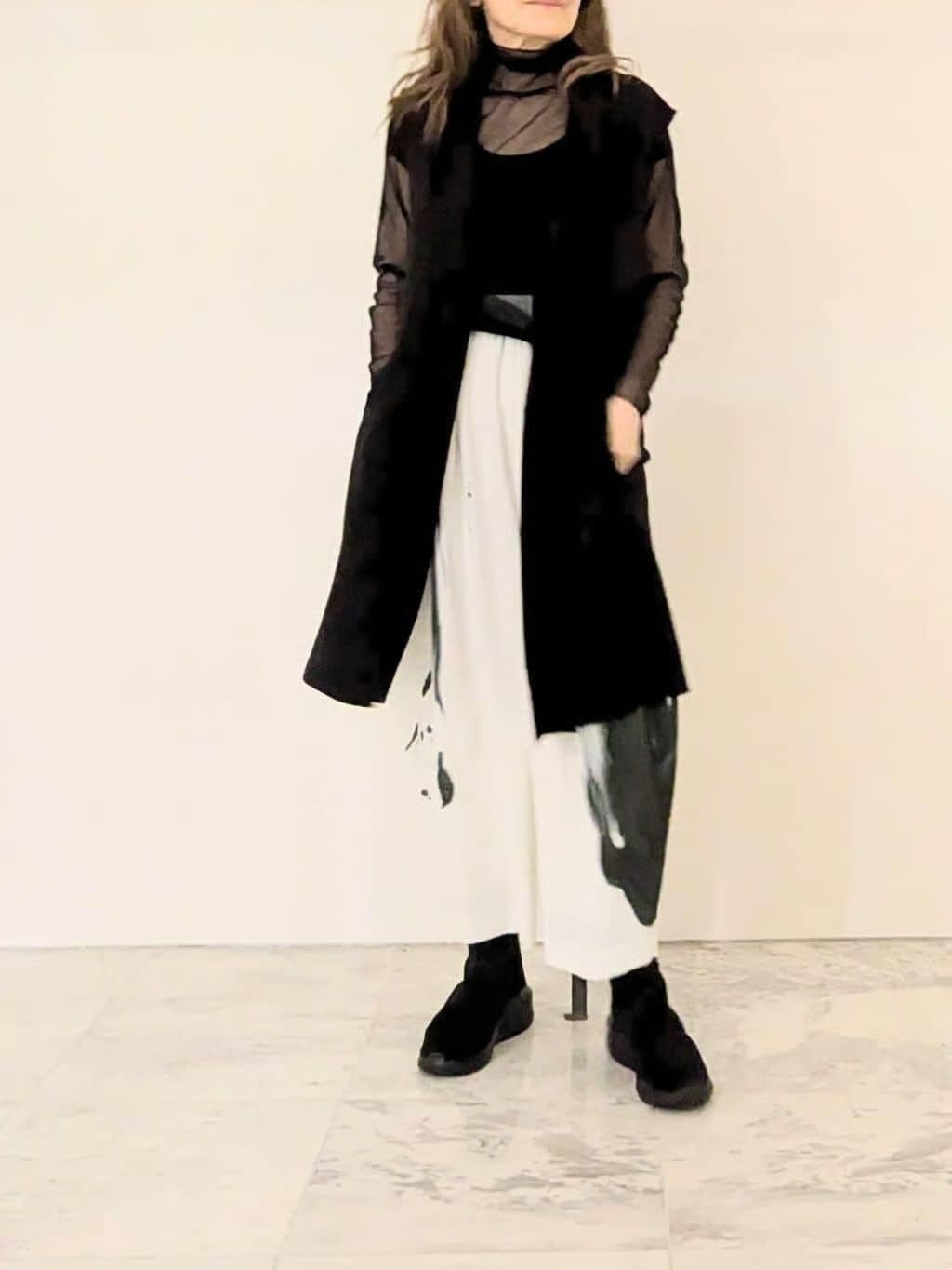 ボトムには、墨絵のグラデーションが印象的なコクーンパンツを合わせ、モノトーンで凛とまとめました。