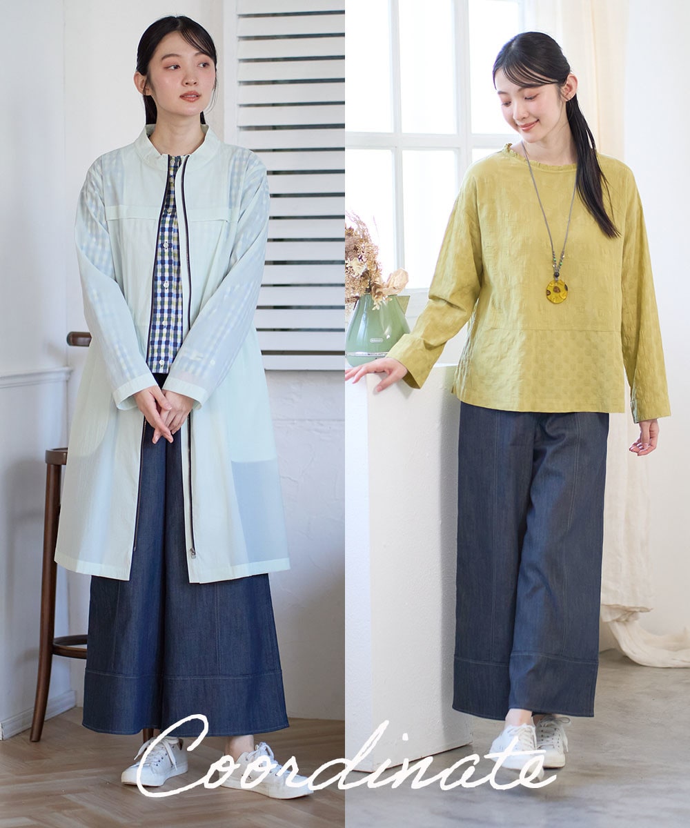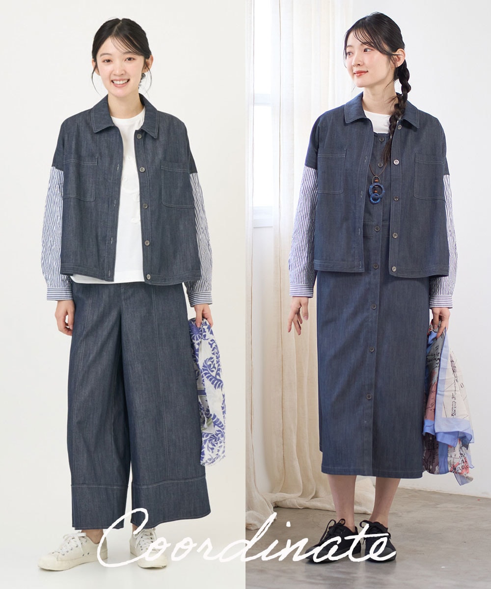 前開き仕様でロングジレのように同素材のボトムとセットアップで羽織るのもおすすめ。