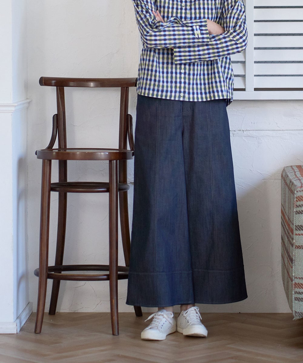 裾に向かって緩やかに広がるフレアシルエットのワイドパンツ。