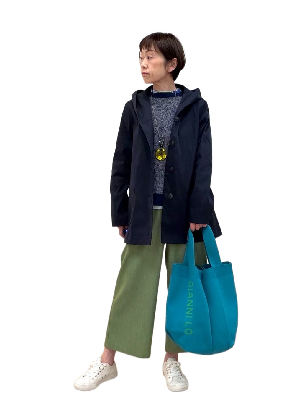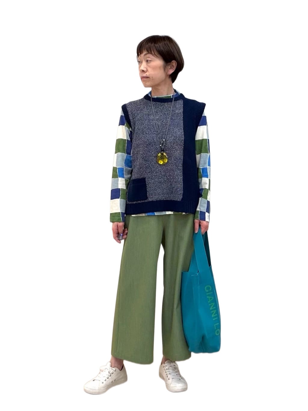 配色が楽しいカットソーにボトムは綺麗なグリーンを合わせました。