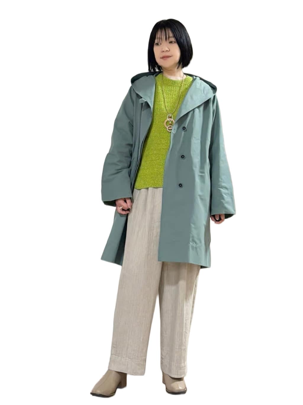着用サイズ:コート M、カットソー M、ニットベスト M、パンツ S 身長:158cm
