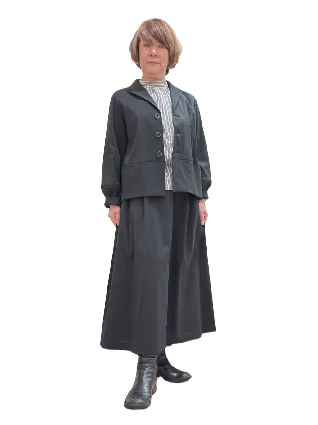 着用サイズ:ジャケット M、ブラウス M、パンツ L 身長:157cm