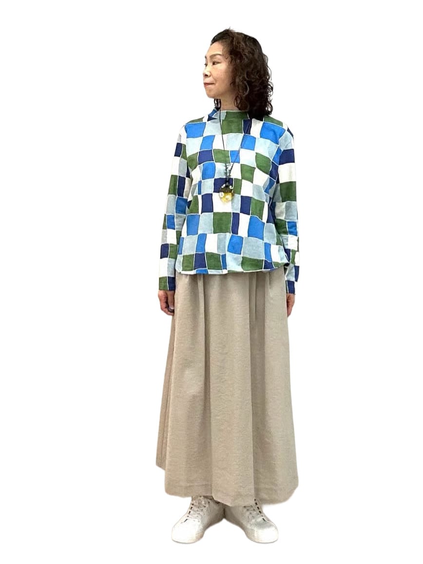 同素材のギャザースカートはゆったりとした着心地と立体的なシルエットでフェミニンな印象に。
