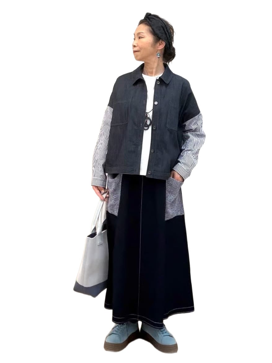 デニムワンピースは縦ラインを強調し、大人の女性らしい洗練された印象を演出。前を開けてジレとしてもok‼︎