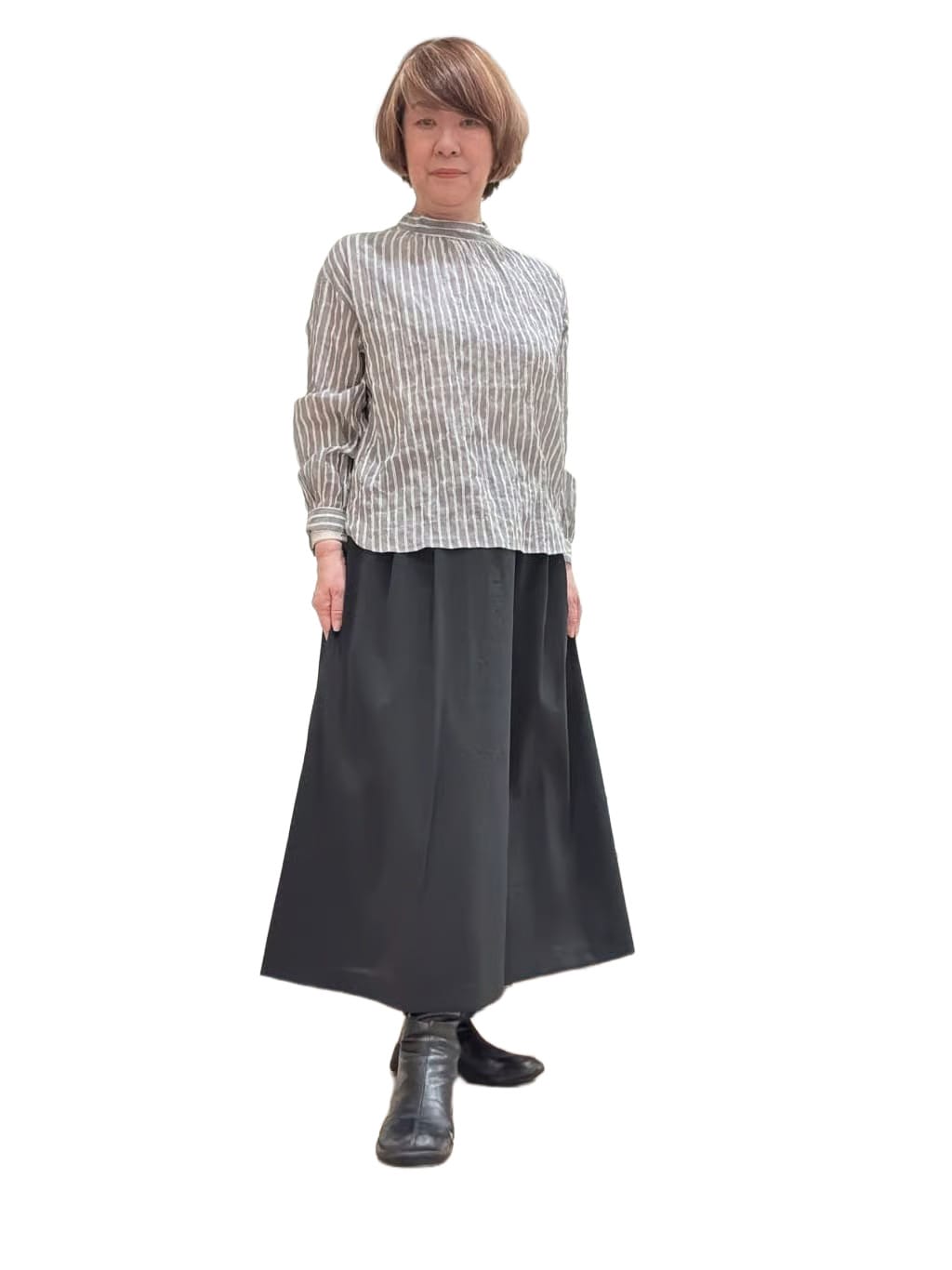 スタンドカラーのかぶりブラウスは、軽やかな素材で、清潔感のある印象です。