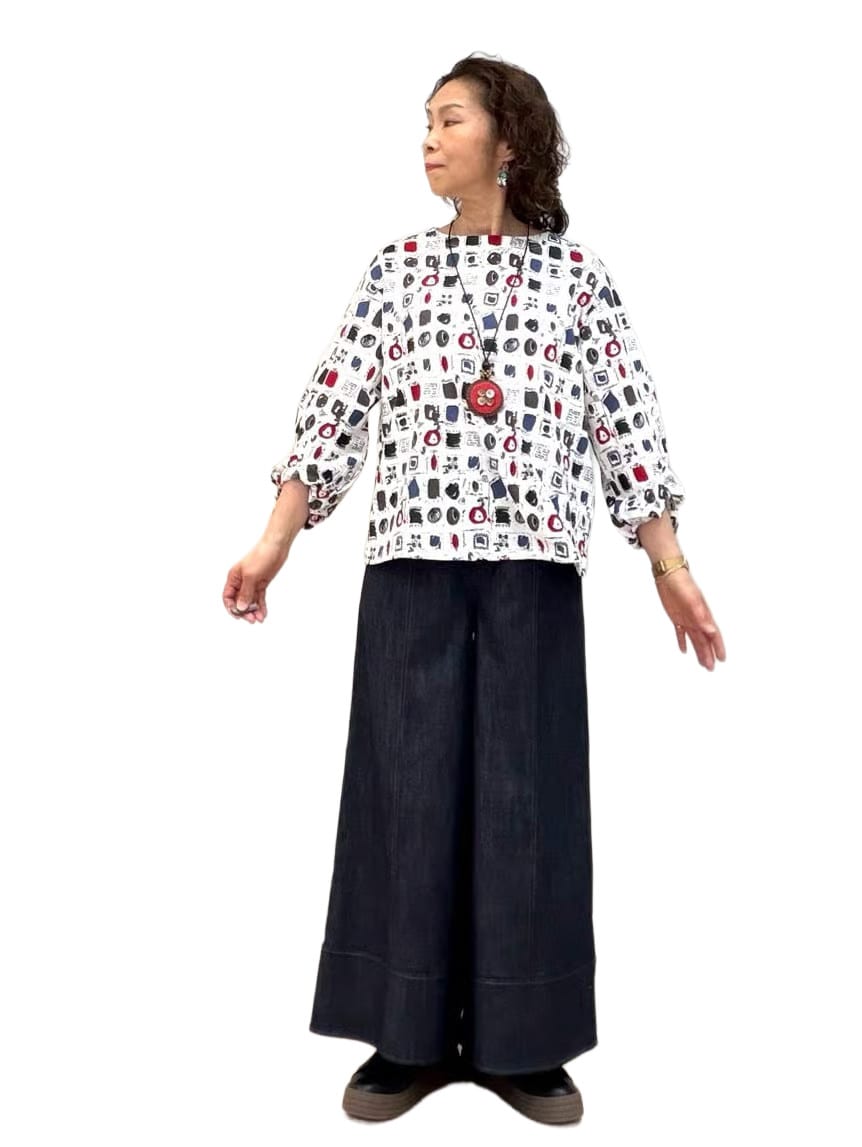 カットソーはカラフルでポップな柄と、やや膨らみを持たせて、