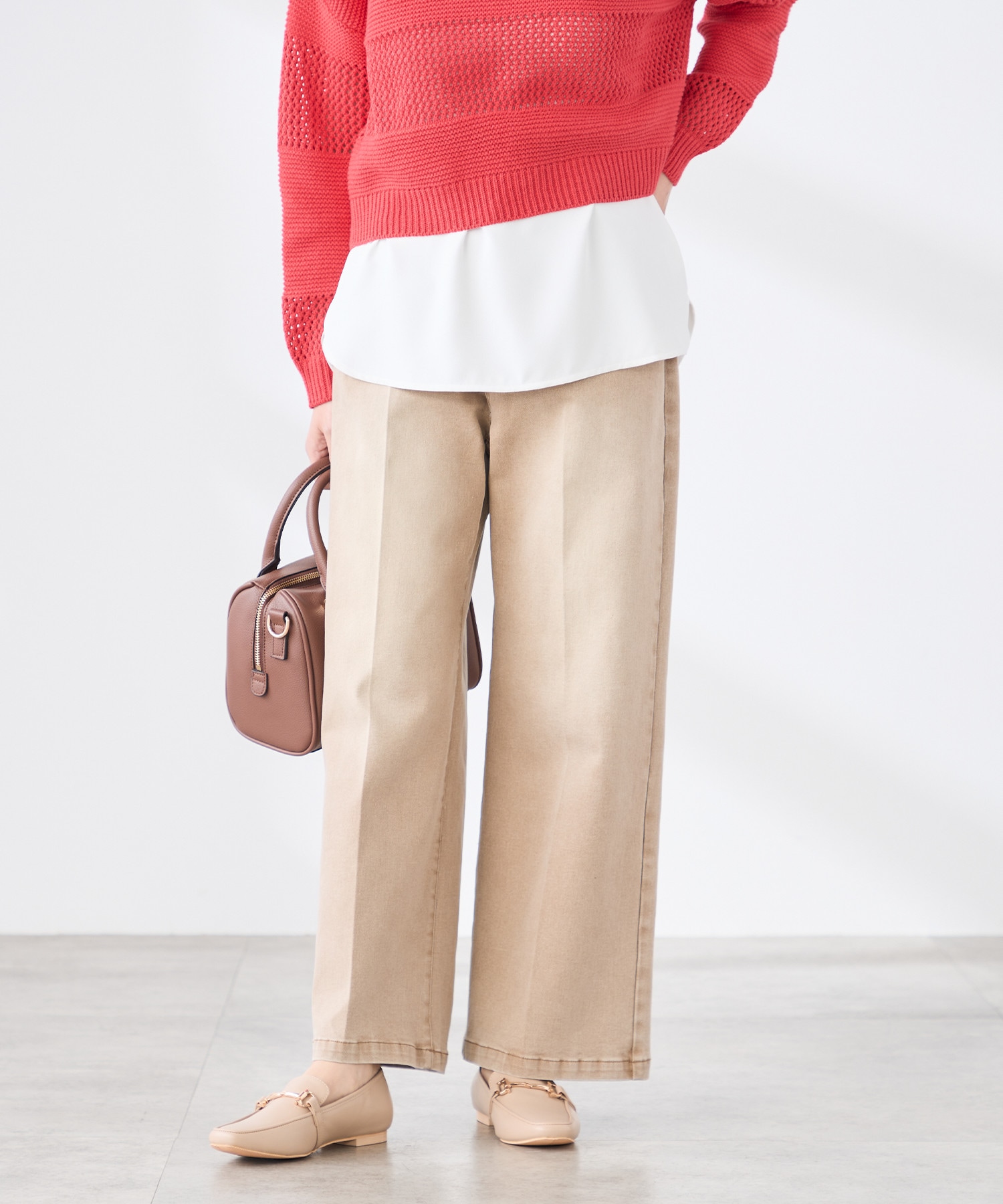 レッドやピンクなどの春色トップスとも相性抜群で、ぐっと華やかなスタイリングに。