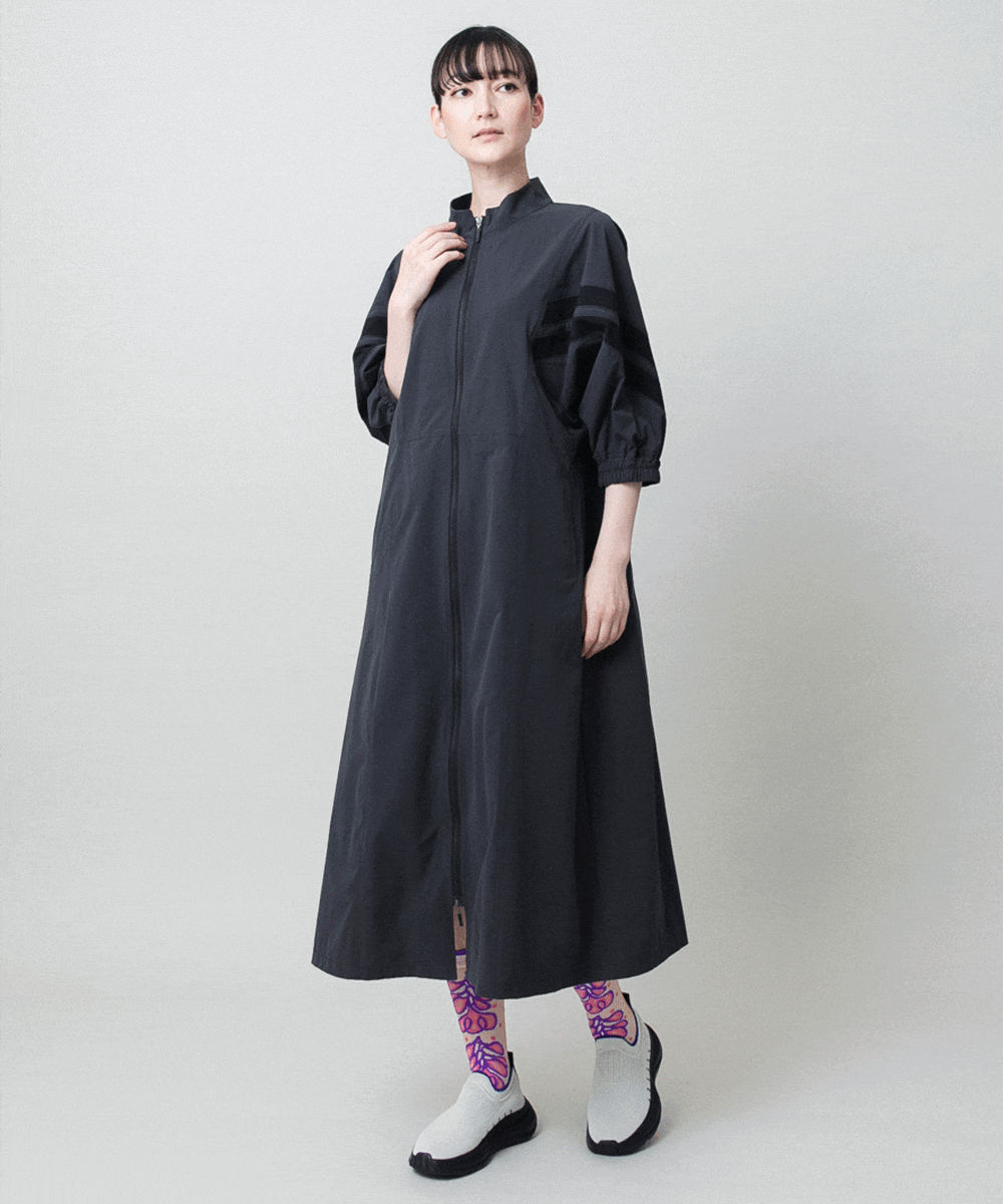 七分袖に施された控えめな配色ラインが、知的なアクセントを演出するフロントジップワンピース。