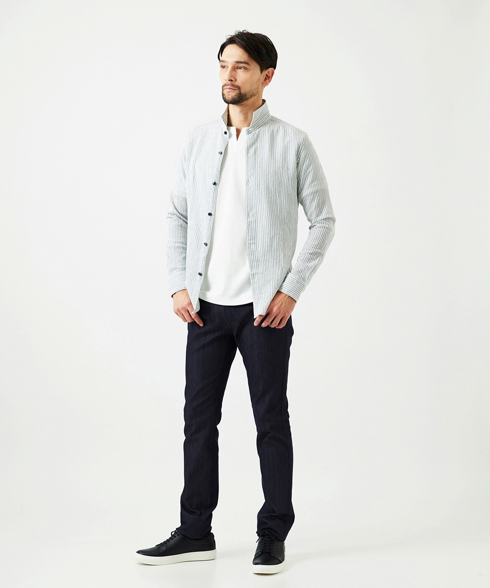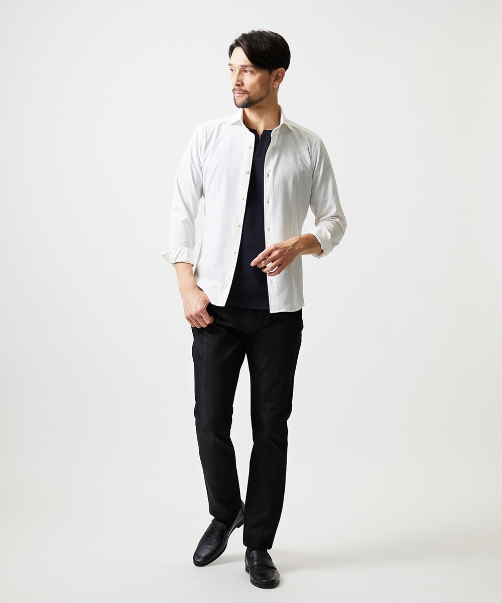 やや短めの着丈はタックアウトにも対応し、ビジネスからカジュアルまで幅広いシーンで活躍する一着です。