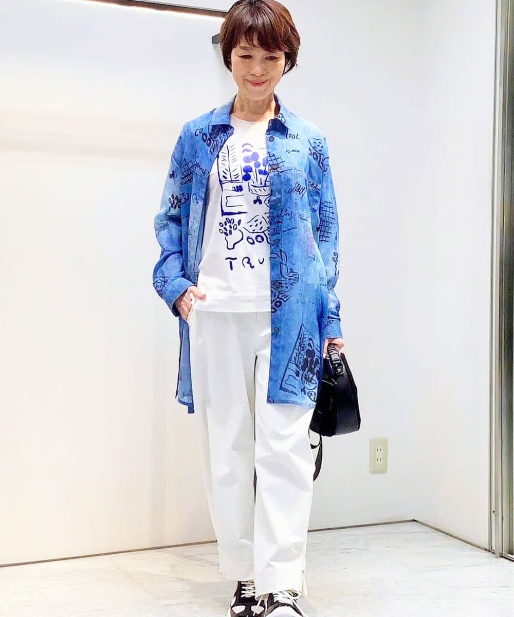 デニム風アートプリントロングシャツは、爽やかな柄と手書き風ロゴが目を引き、リラックスした休日やランチ会に華を添えます。