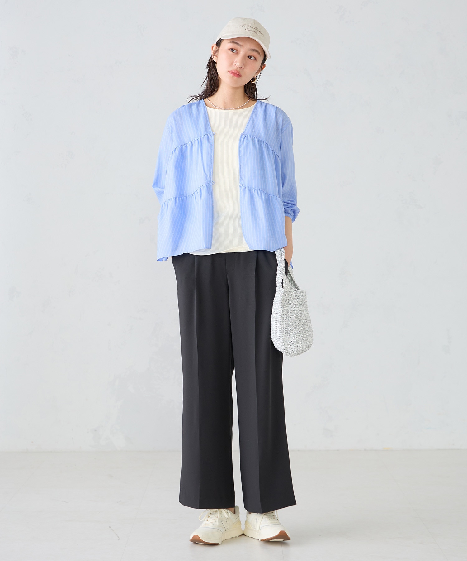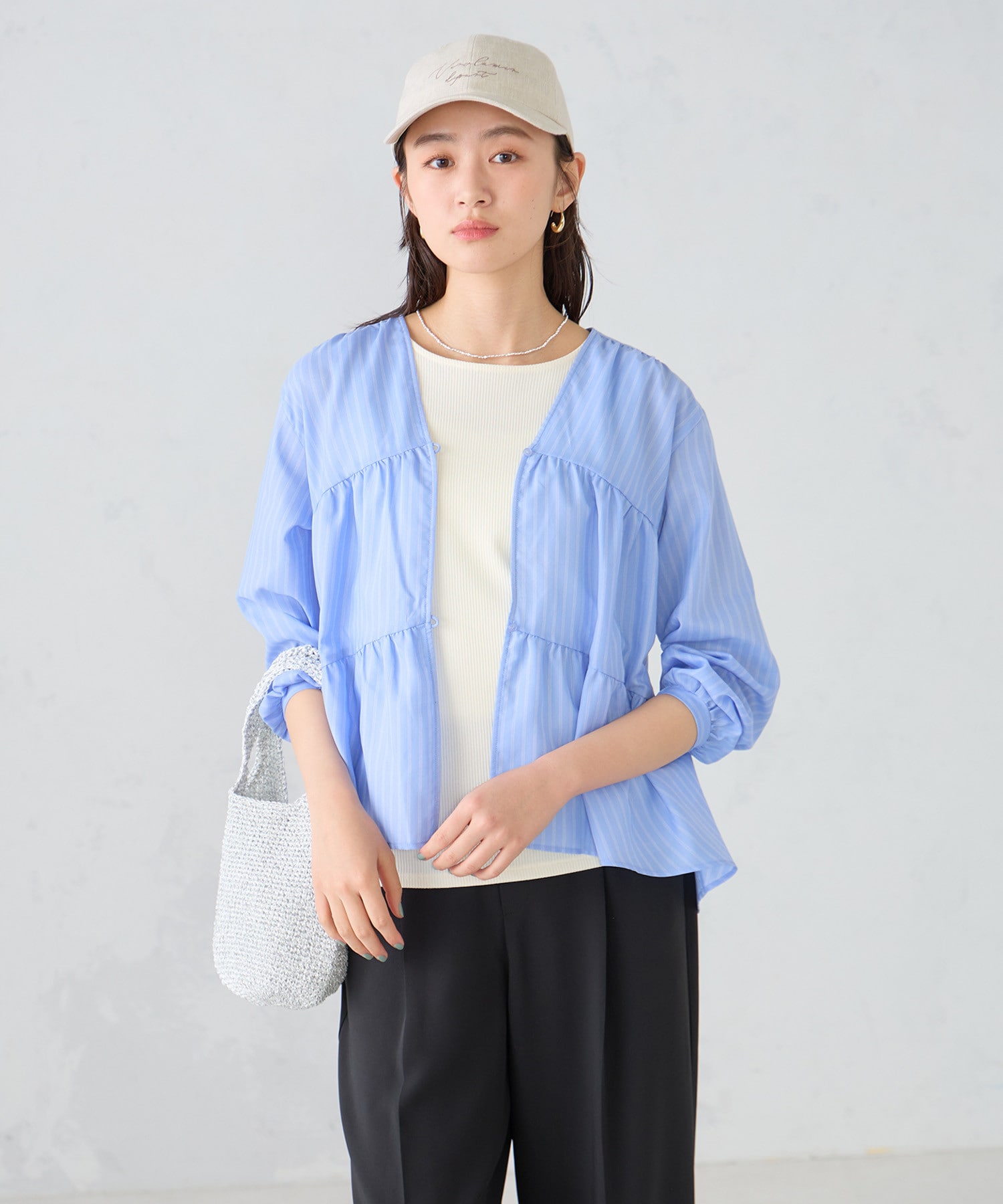 前後にギャザーが入ったティアードデザインのシアーブラウスです。後ろはおしりが隠れる丈でふんわりとしたシルエットが大人可愛い一着。爽やかなブルーストライプはこれからの季節にぴったり◎釦を開けた羽織りスタイルはもちろん、閉じて一枚着ブラウスとしても着回せます。シワになりにくいイージーケアな素材なので持ち運びにも便利です。