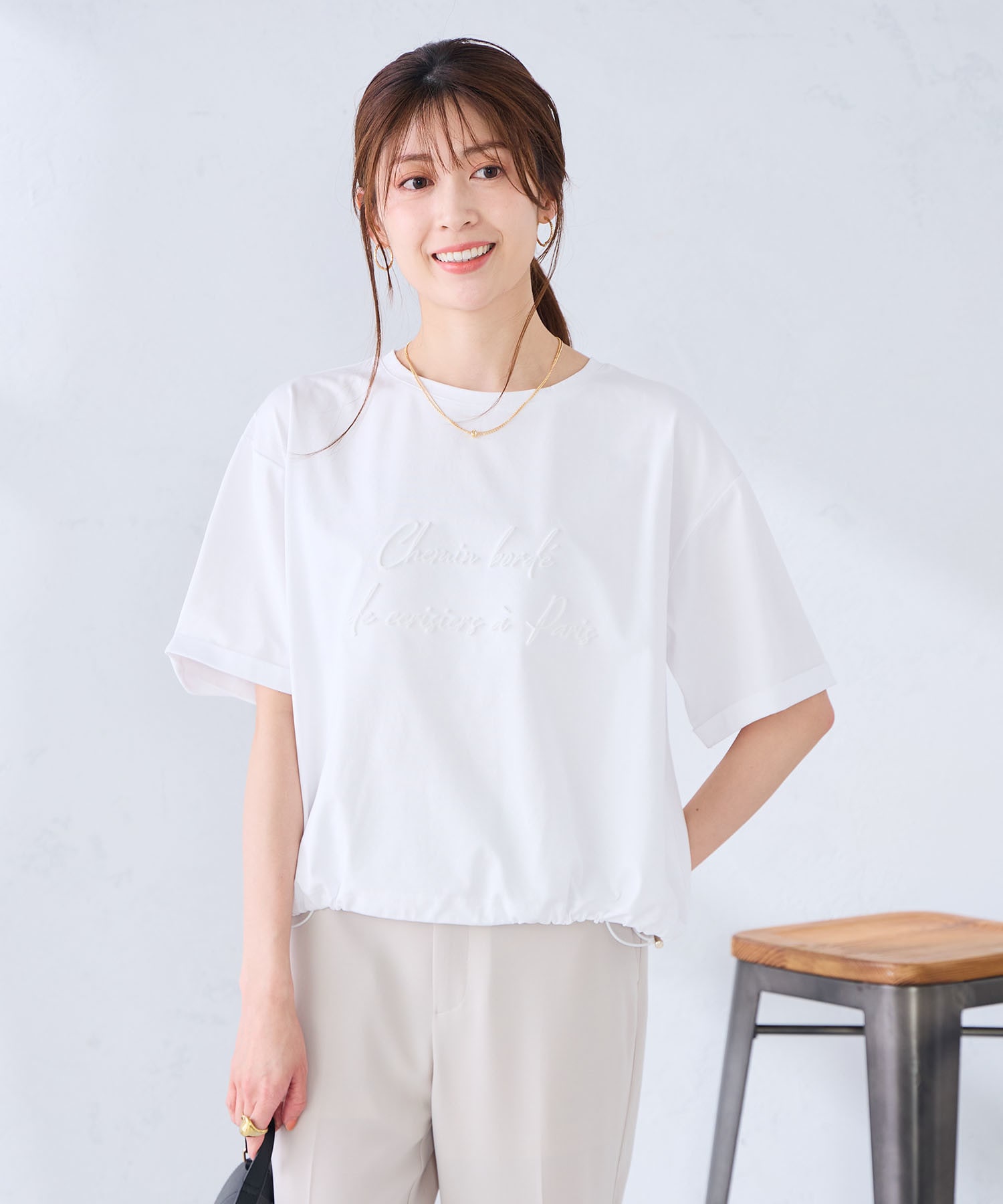 意匠感のある細いサガラ刺繍が大人可愛いTシャツ。同色のロゴ刺繍でさりげない主張が大人なカジュアルスタイルに。裾がドロスト仕様になっておりシルエットを調節できるのも人気のポイント◎明るいトーンでまとめれば洗練されたカジュアルスタイルに!