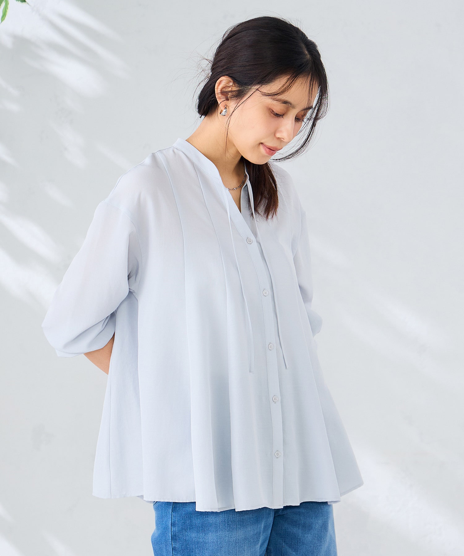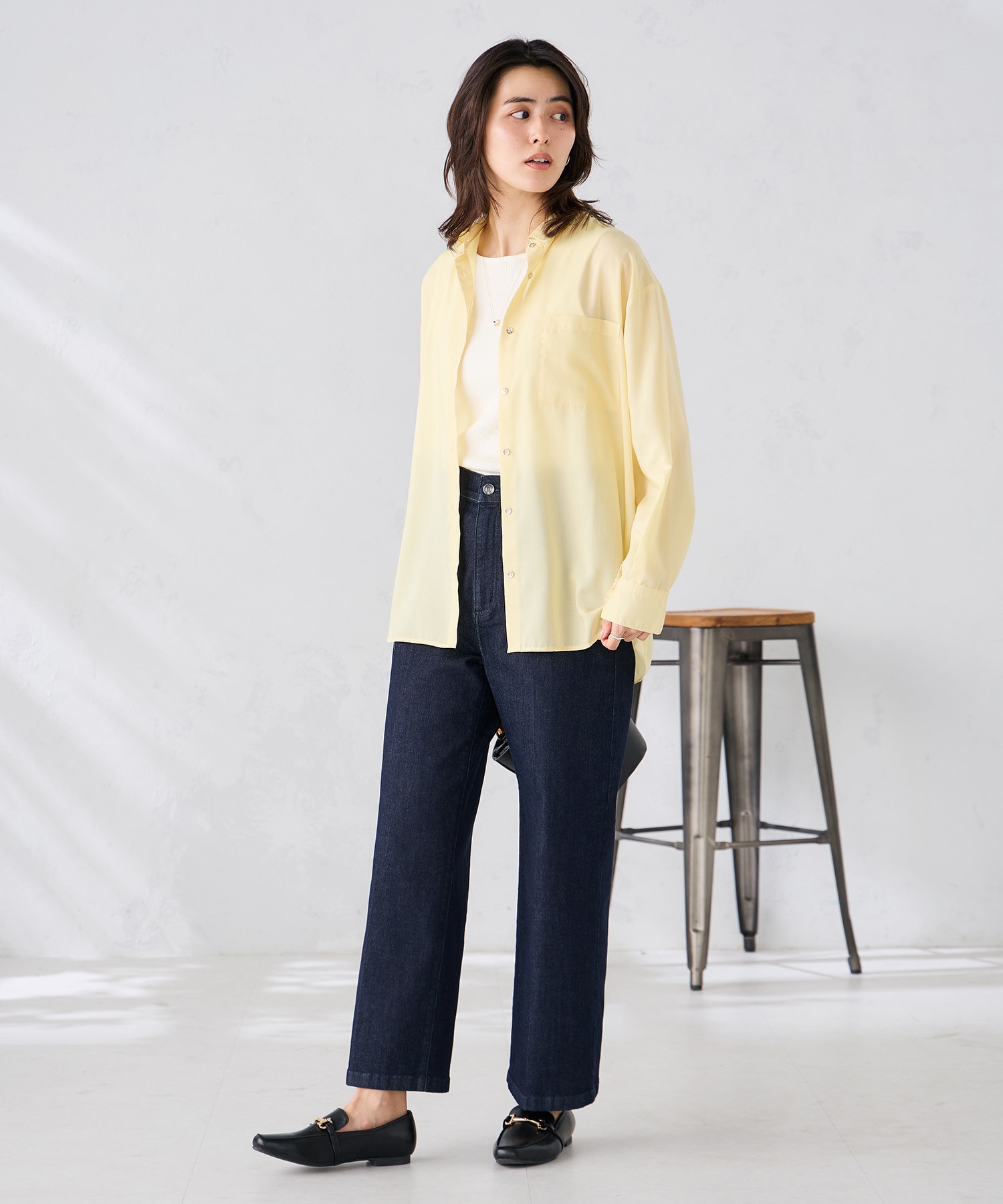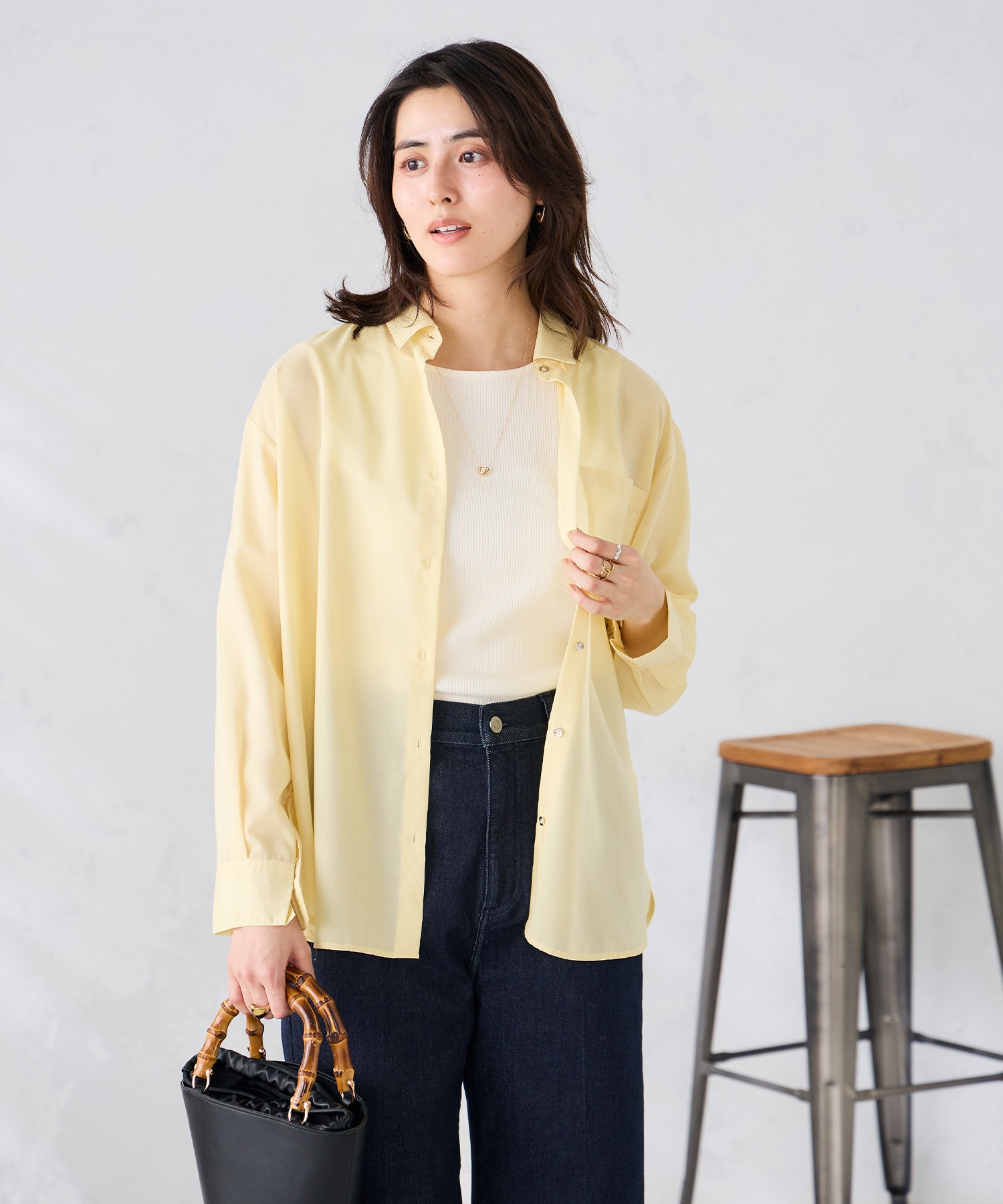 透けすぎない程よいシアー感が着やすいバックタックデザインのシアーシャツ。サラサラタッチの肌触りの良い素材で、春先から夏まで長く着用できます◎洗ってもしわが気にならないイージーケア素材なので持ち運びや長時間の移動にも重宝します。半袖やノースリーブの上に涼しく羽織れるのでおでかけの日よけ対策に重宝すること間違いなしです。