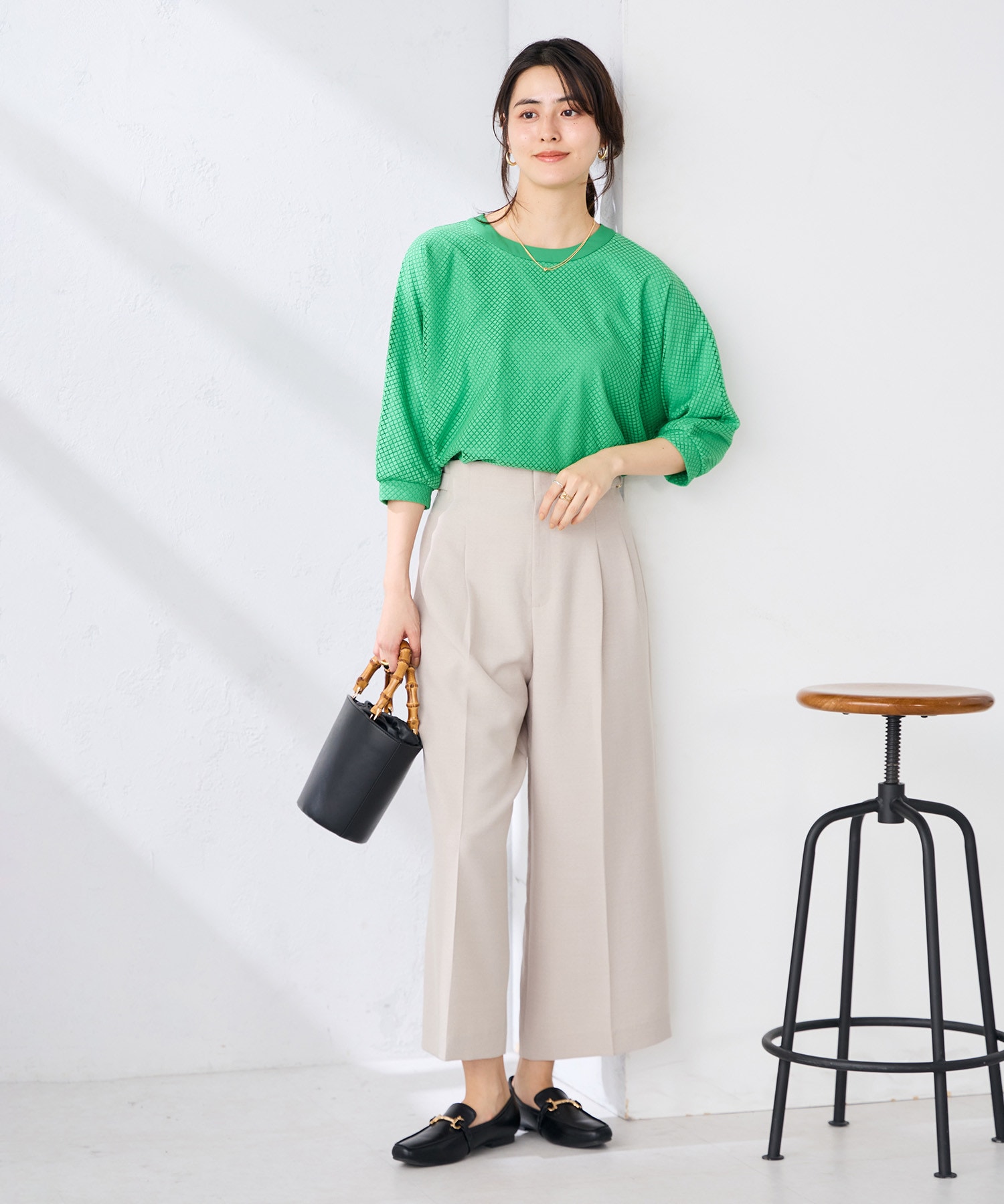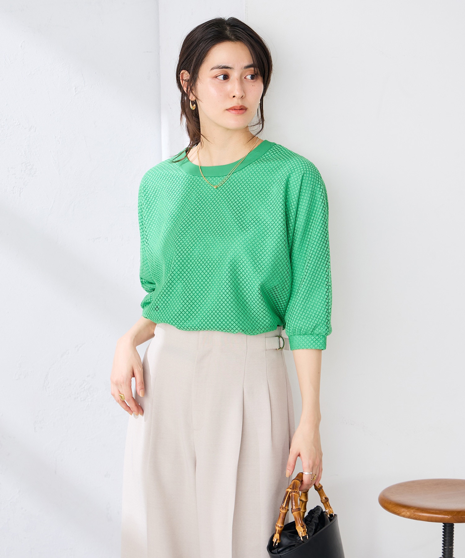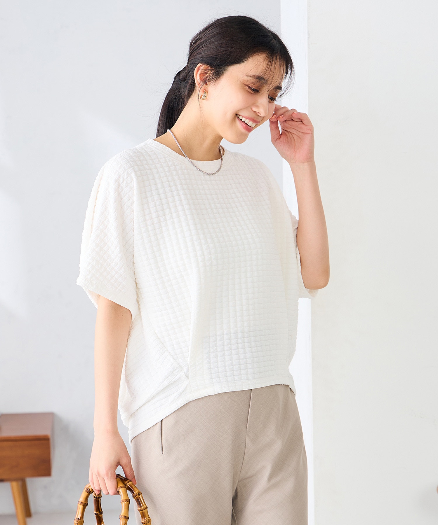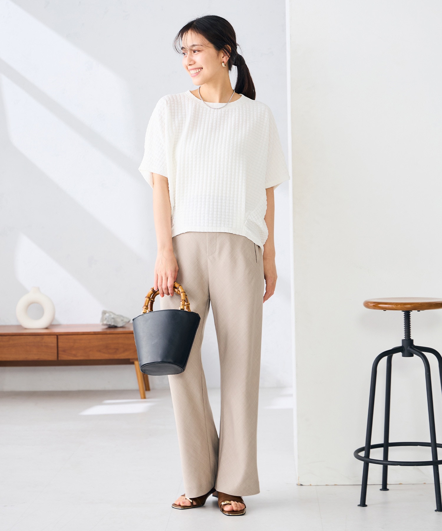 凹凸感のあるポコポコ素材を使用したドルマンシルエットのカットソー。裾のタックが立体感のあるシルエットを出してくれ、ボディラインも拾いづらいのが嬉しいポイント◎程よいクロップド丈なので、ボトムとのバランスも取りやすくシンプルなパンツと合わせるだけでもサマ見えします。