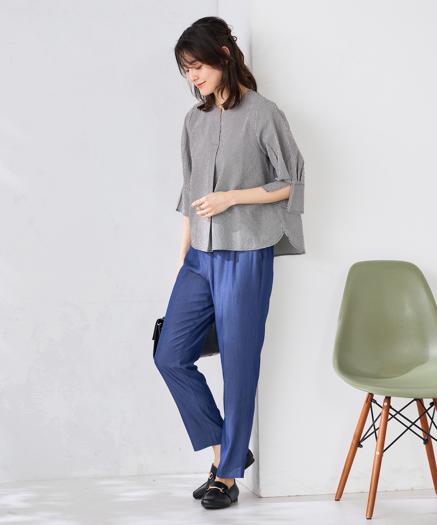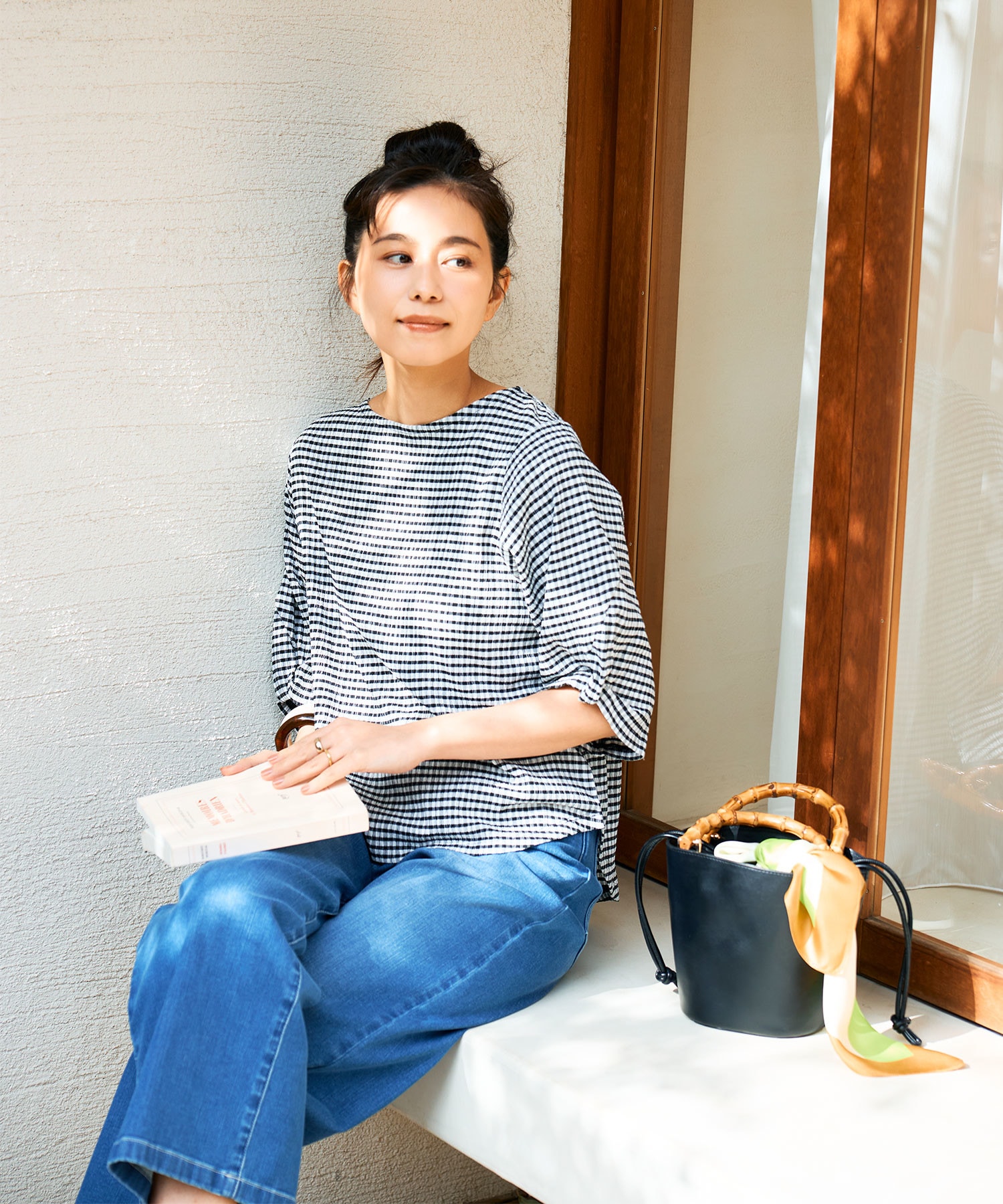 表面感がある小さいチェック柄素材を使用した、袖口のねじったようなデザインがポイントのカットソートップス。楊柳素材はさらっとして肌離れがよく、ストレッチ性を持った素材なので着心地抜群です。シンプルにデニムと合わせるだけで着映える優秀な一着。