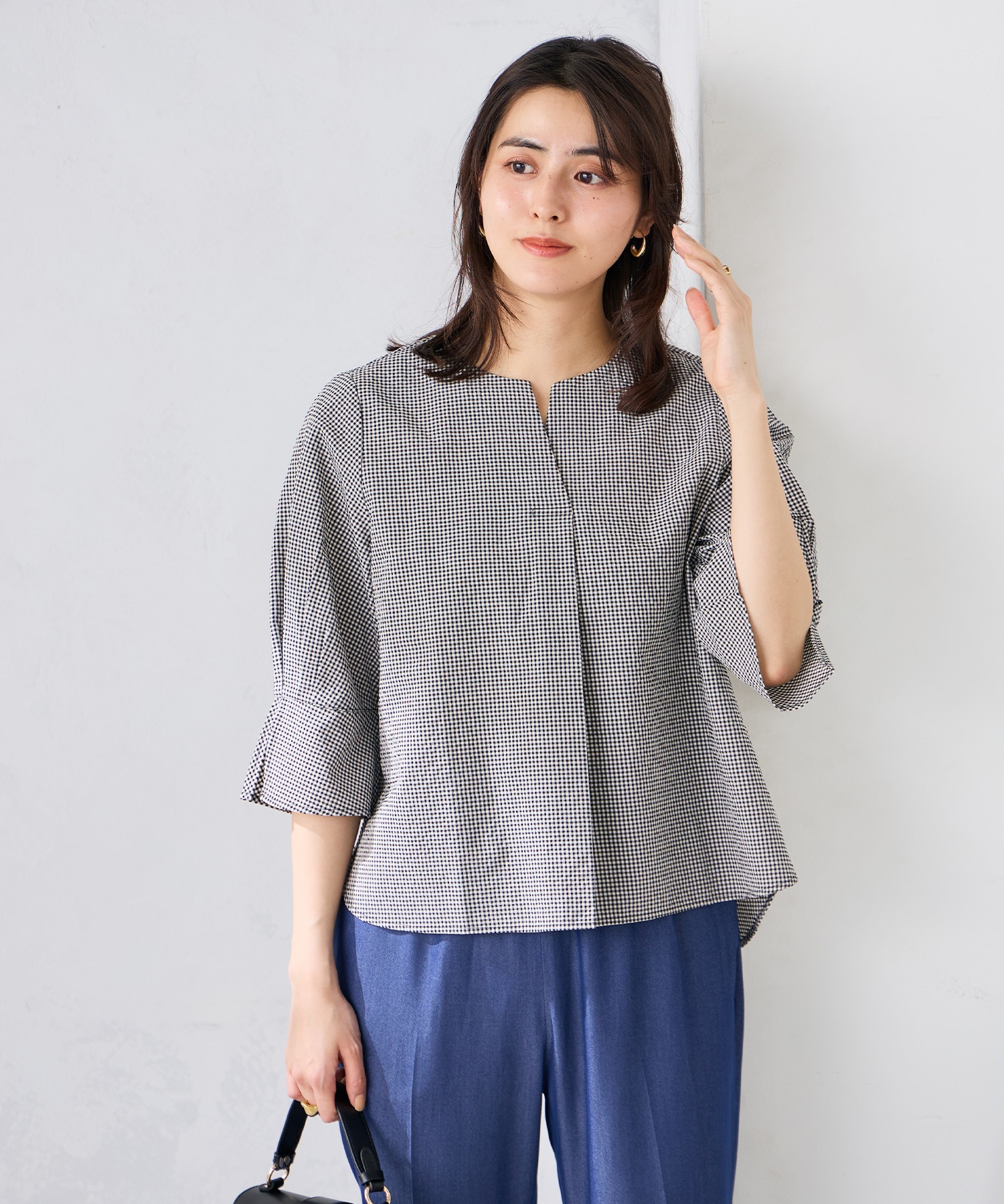 清涼感のあるサッカー素材のスキッパーブラウス。細かいギンガムチェック柄は着回しやすさと着映えを両立◎肌離れの良く暑い時期にも着やすいサッカー素材はこれからの季節に嬉しいアイテム◎お尻が隠れる安心丈で、裾はインしなくても決まるラウンドヘムシルエットです。カラーによって柄が違うのも選べて楽しい◎[ブルー:無地、ライトブルー:ストライプ]