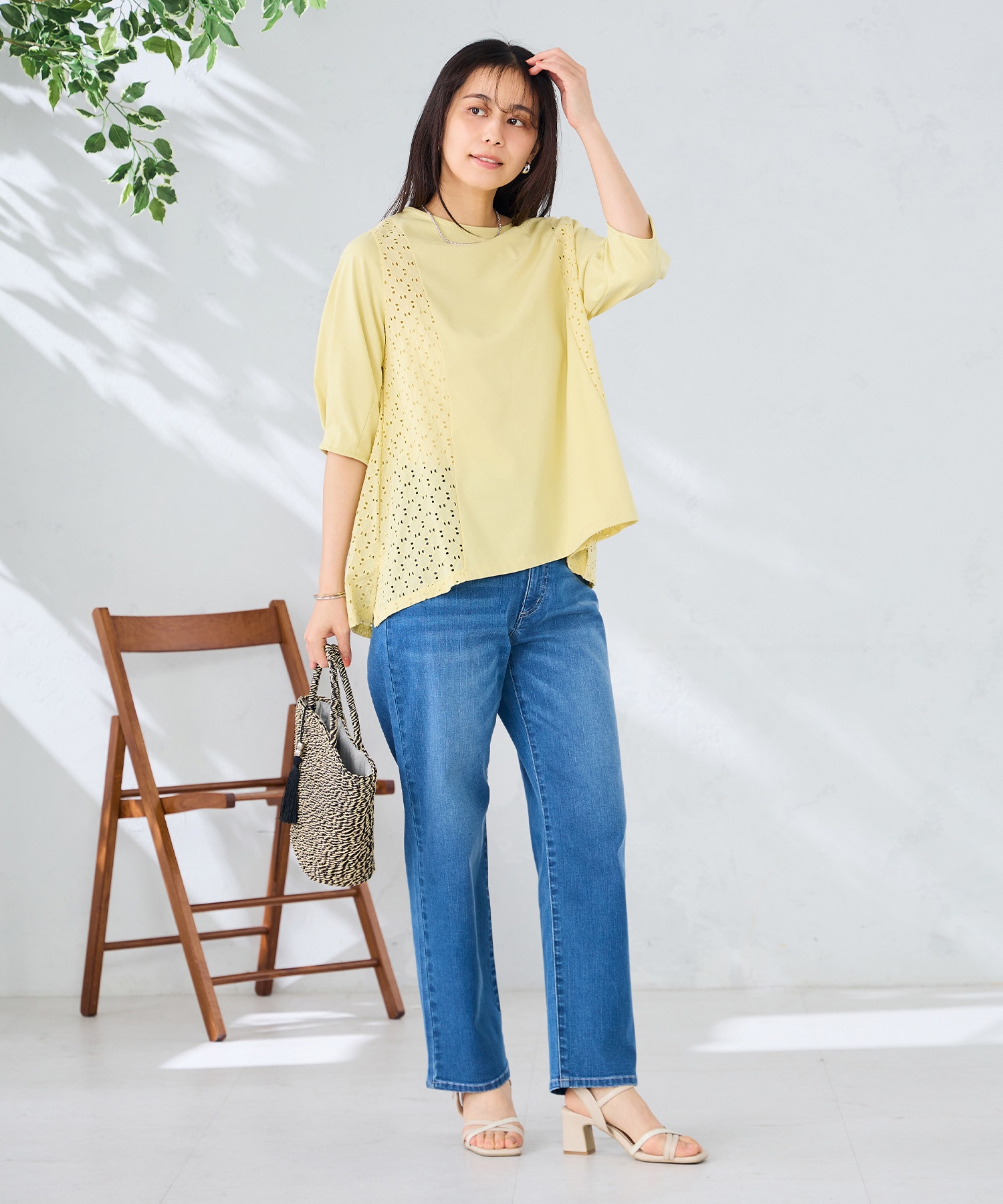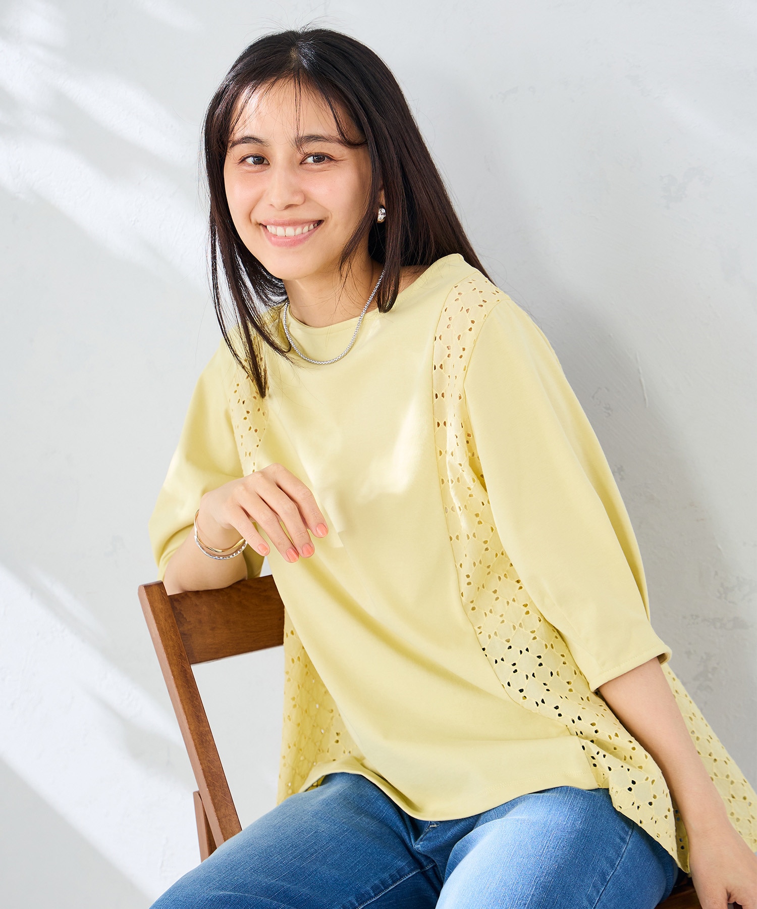 両脇にレース切替の入ったAラインのデザインカットソー。前後差のある着丈で、横からのシルエットも素敵です◎今年らしいライトイエローは爽やかに着映えならがもデニム、ブラック、ネイビー、ホワイトなどどんな定番カラーのパンツでも合わせやすく鮮度と着回し力の両立が叶います◎