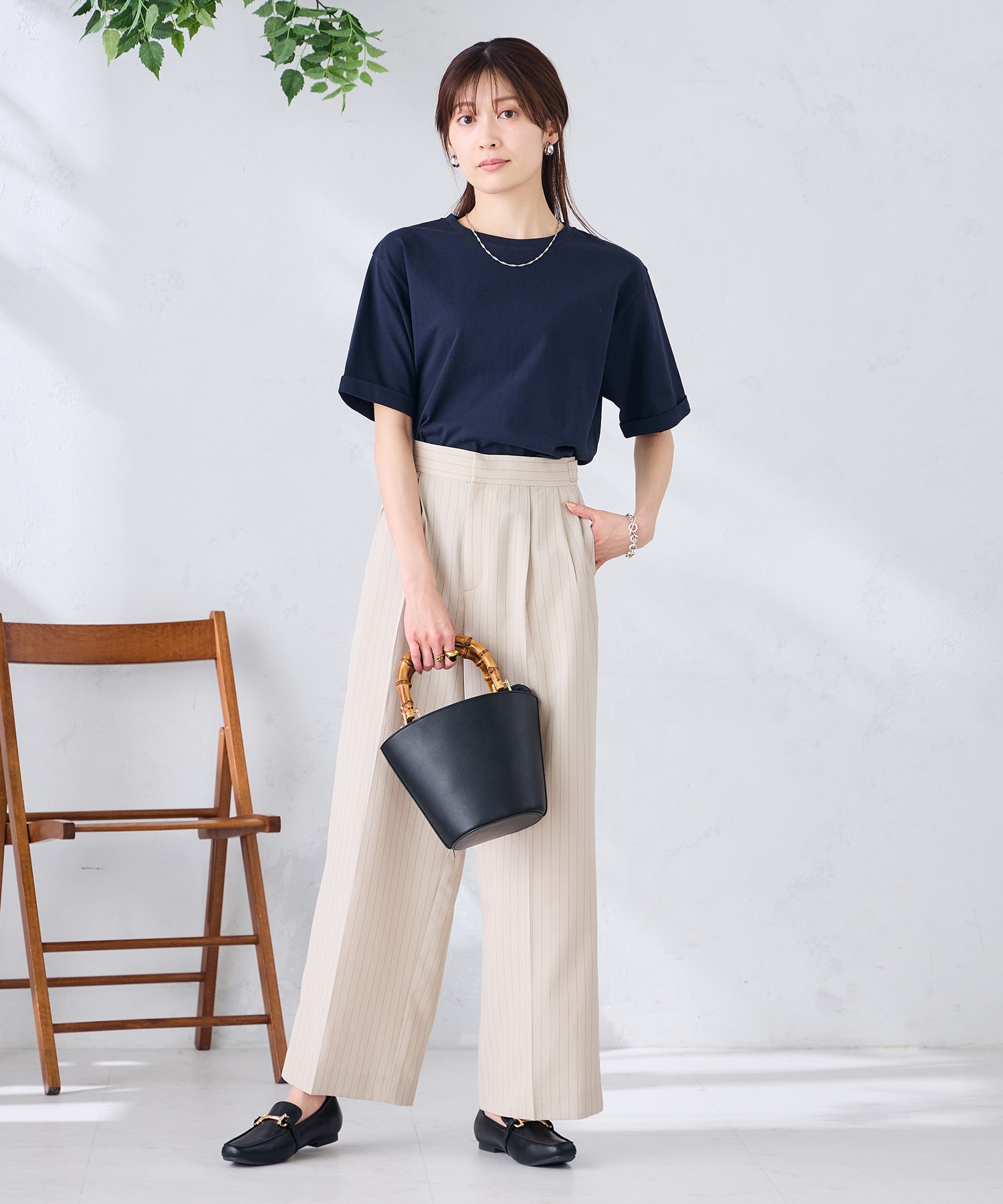 袖にタックを施したデザインカットソー。シンプルながらも立体感のあるシルエットで腰周りをさりげなくカバーできる着丈です。ボトムにインで着てもアウトで着てもバランスが良いのでスカートスタイルもパンツスタイルも楽しめます◎これからの季節に嬉しい接触冷感、UVカット機能も完備したトップスは絶対に持っておきたいアイテムです。