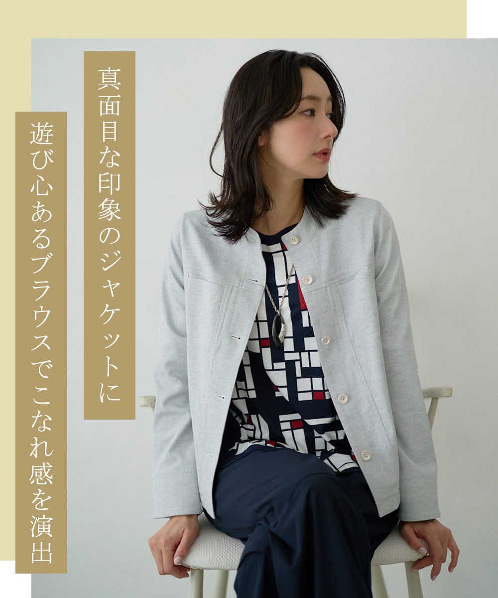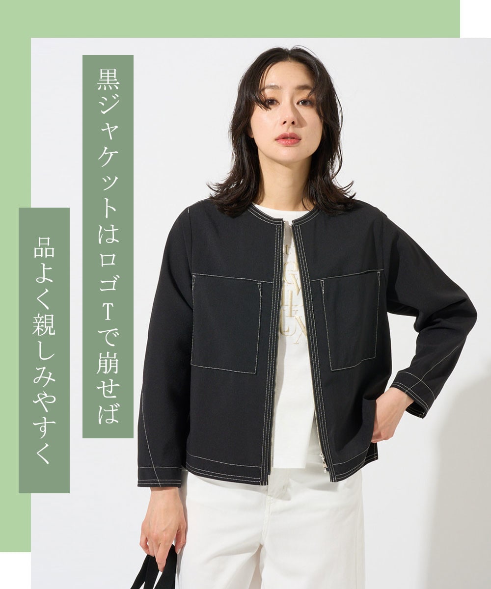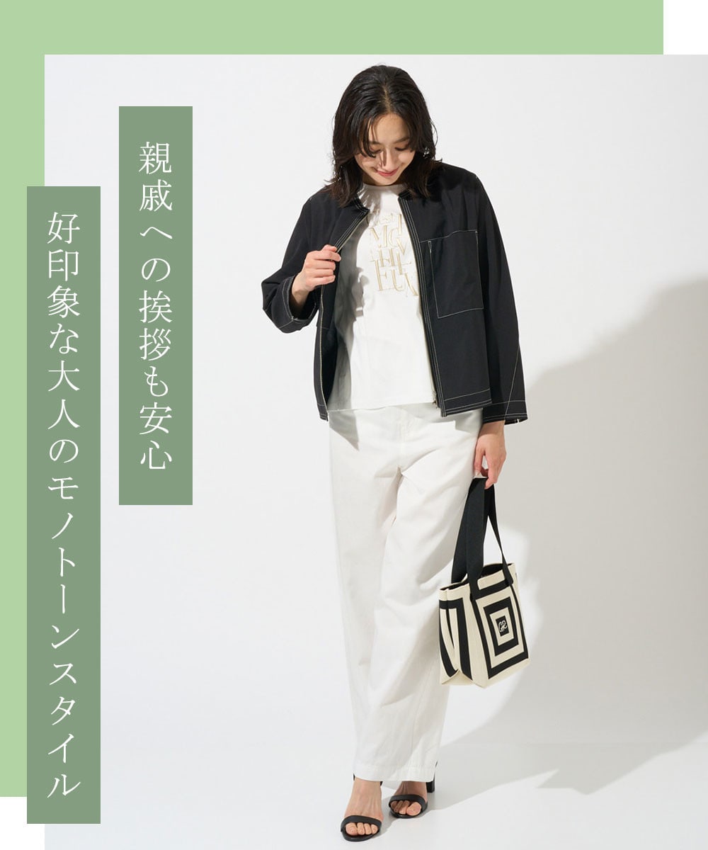 久しぶりの親戚へのご挨拶は、黒のノーカラージャケットで端正に。