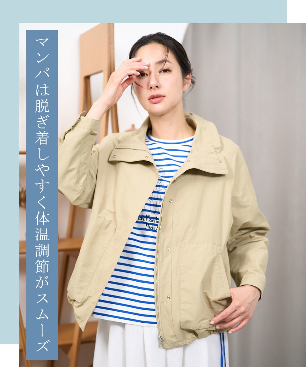 定番のボーダーにベージュのマンパを羽織れば、どんな景色にも馴染む洗練カジュアルの完成。