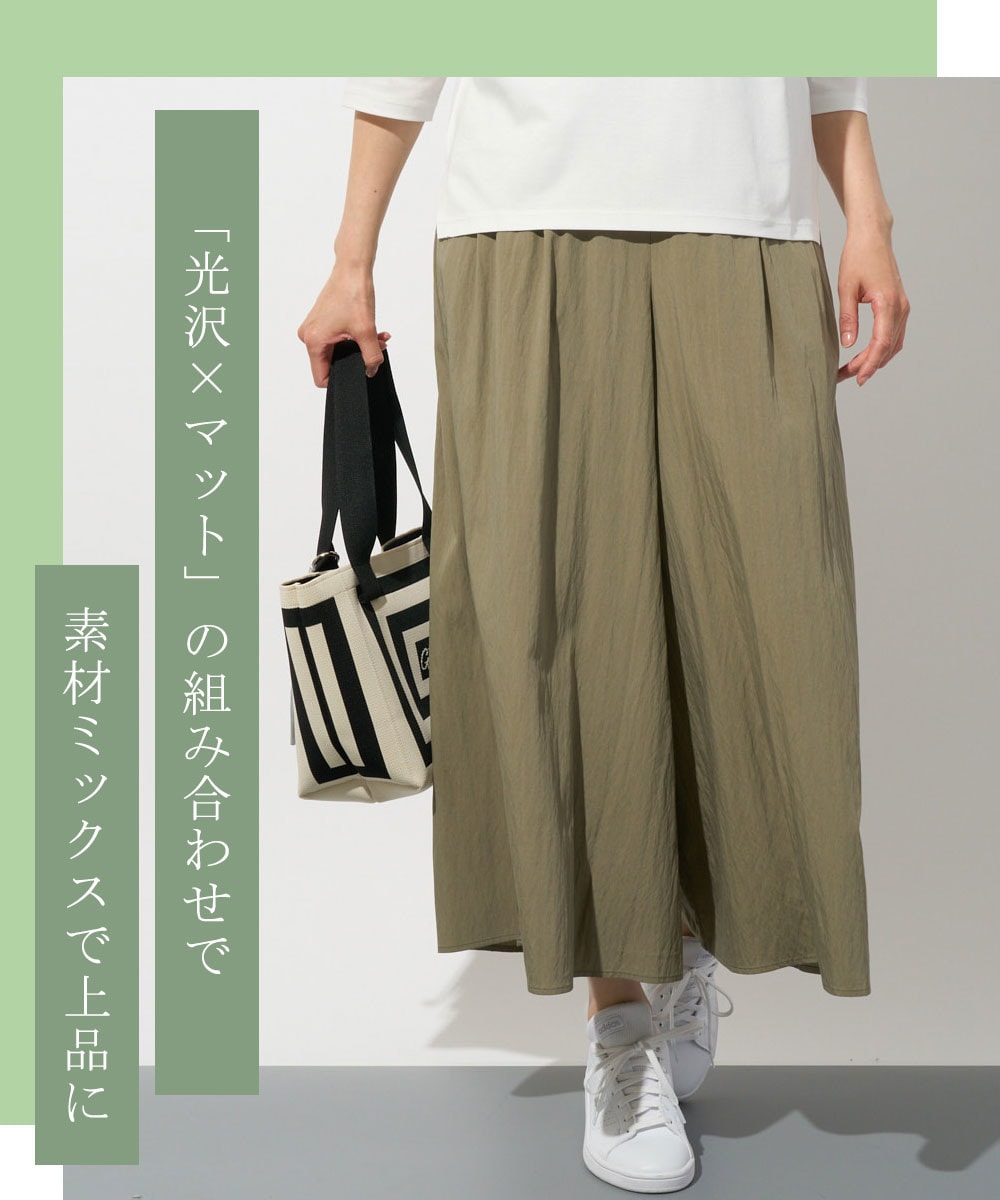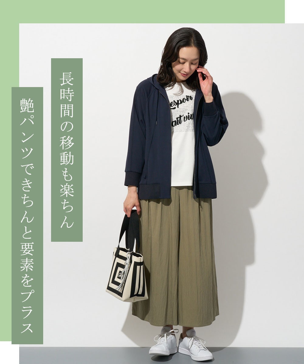 ほどよいツヤ感ととろみ素材のパンツパンツを選ぶだけで、パーカー合わせでも手抜きに見えないきれいめカジュアルなスタイルが完成します。