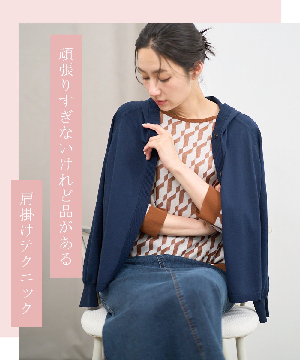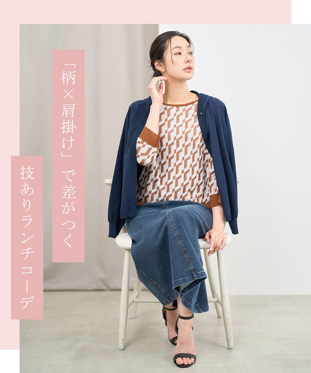 上半身にポイントがある柄ニットは、座った姿勢でも華やかに。