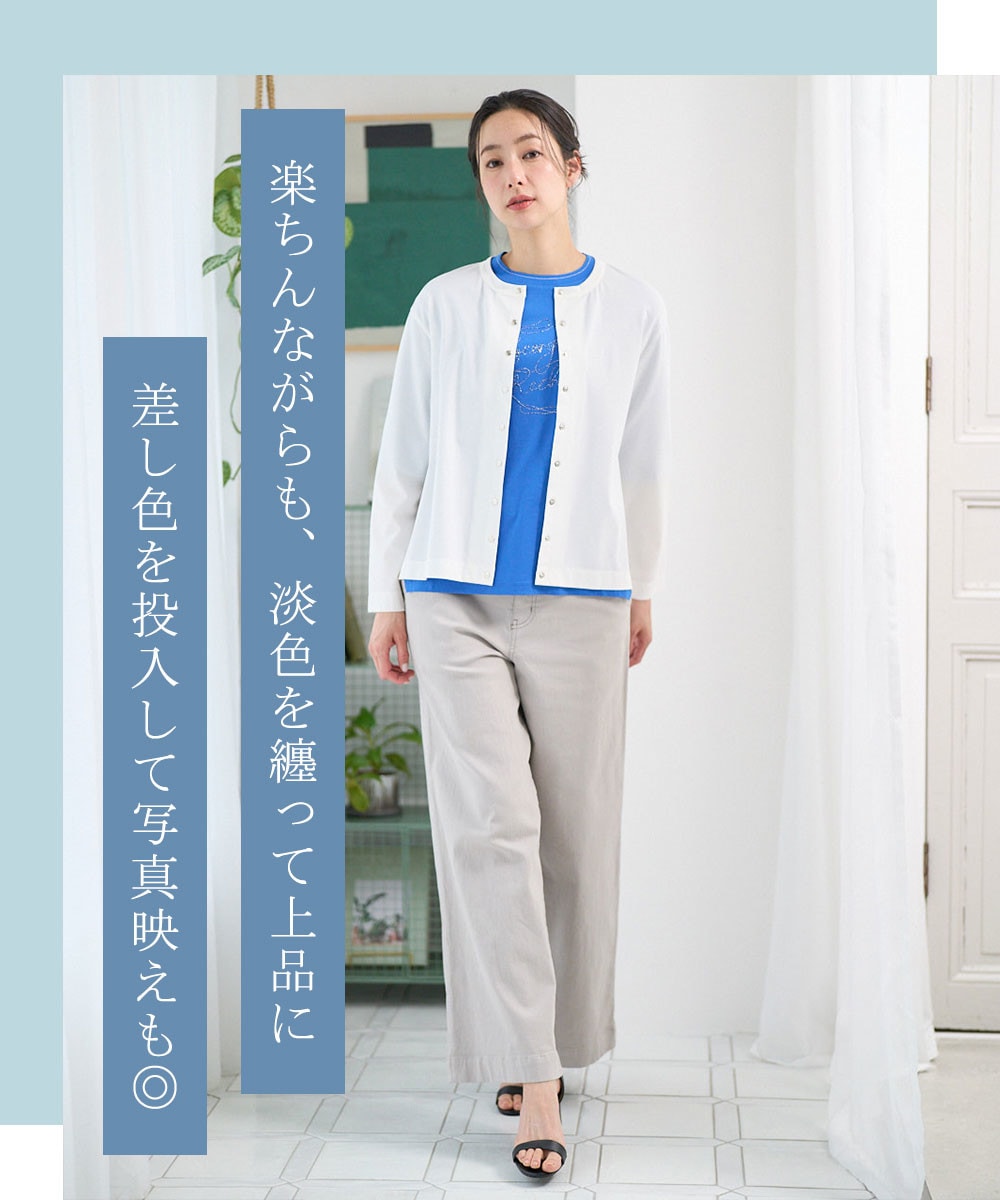 ネイビーの知性と白パンツの清潔感が、会議や大切な打ち合わせでも、信頼感のある佇まいを演出します。